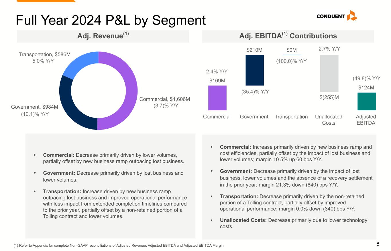 7 Full Year 2024 P&L Metrics $3,320M $3,176M 2023 2024 $0M $2,000M $4,000M (4.3)% Y/Y (4.3)% in CC(2) Adj. Revenue(1) $247M / 7.4% $124M / 3.9% 2023 2024 $0M $100M $200M $300M Adj. EBITDA(1) / Adj. EBITDA Margin(1) (49.8)% Y/Y • Adj. Revenue(1): Decline primarily driven by lost business and lower volumes, partially offset by new business ramp particularly in our Commercial and Transportation segments. • Adj. EBITDA(1) and Adj. EBITDA Margin(1): Decline primarily driven by the Government segment due to lost business, lower volumes and the absence of a recovery settlement in the prior year, partially offset by new business ramp and cost efficiencies. (4.3)% (.2)% (5.0)% (6.0)% (6.0)% Q4' 23 Q1' 24 Q2' 24 Q3' 24 Q4' 24 Adj. Revenue(1) Trend (Y/Y Compare) (1) Refer to Appendix for complete Non-GAAP reconciliations of Adjusted Revenue, Adjusted EBITDA and Adjusted EBITDA Margin. (2) Refer to definition in Appendix.