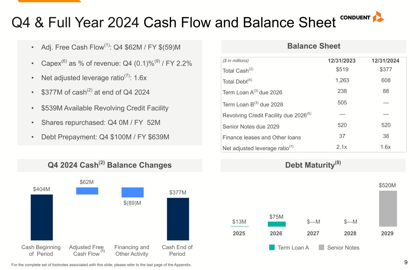 8 $169M $210M $0M $(255)M $124M Commercial Government Transportation Unallocated Costs Adjusted EBITDA Full Year 2024 P&L by Segment (1) Refer to Appendix for complete Non-GAAP reconciliations of Adjusted Revenue, Adjusted EBITDA and Adjusted EBITDA Margin. Commercial, $1,606M Government, $984M Transportation, $586M 5.0% Y/Y (10.1)% Y/Y (3.7)% Y/Y (100.0)% Y/Y (35.4)% Y/Y 2.4% Y/Y Adj. Revenue(1) Adj. EBITDA(1) Contributions (49.8)% Y/Y 2.7% Y/Y • Commercial: Decrease primarily driven by lower volumes, partially offset by new business ramp outpacing lost business. • Government: Decrease primarily driven by lost business and lower volumes. • Transportation: Increase driven by new business ramp outpacing lost business and improved operational performance with less impact from extended completion timelines compared to the prior year, partially offset by a non-retained portion of a Tolling contract and lower volumes. • Commercial: Increase primarily driven by new business ramp and cost efficiencies, partially offset by the impact of lost business and lower volumes; margin 10.5% up 60 bps Y/Y. • Government: Decrease primarily driven by the impact of lost business, lower volumes and the absence of a recovery settlement in the prior year; margin 21.3% down (840) bps Y/Y. • Transportation: Decrease primarily driven by the non-retained portion of a Tolling contract, partially offset by improved operational performance; margin 0.0% down (340) bps Y/Y. • Unallocated Costs: Decrease primarily due to lower technology costs.