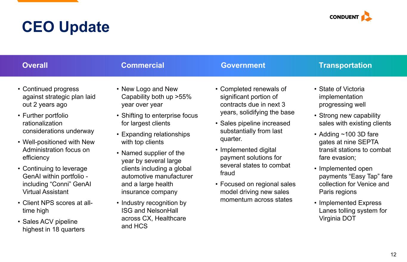 12 Overall Commercial Government Transportation CEO Update • Continued progress against strategic plan laid out 2 years ago • Further portfolio rationalization considerations underway • Well-positioned with New Administration focus on efficiency • Continuing to leverage GenAI within portfolio - including “Conni” GenAI Virtual Assistant • Client NPS scores at all- time high • Sales ACV pipeline highest in 18 quarters • New Logo and New Capability both up >55% year over year • Shifting to enterprise focus for largest clients • Expanding relationships with top clients • Named supplier of the year by several large clients including a global automotive manufacturer and a large health insurance company • Industry recognition by ISG and NelsonHall across CX, Healthcare and HCS • Completed renewals of significant portion of contracts due in next 3 years, solidifying the base • Sales pipeline increased substantially from last quarter. • Implemented digital payment solutions for several states to combat fraud • Focused on regional sales model driving new sales momentum across states • State of Victoria implementation progressing well • Strong new capability sales with existing clients • Adding ~100 3D fare gates at nine SEPTA transit stations to combat fare evasion; • Implemented open payments “Easy Tap” fare collection for Venice and Paris regions • Implemented Express Lanes tolling system for Virginia DOT