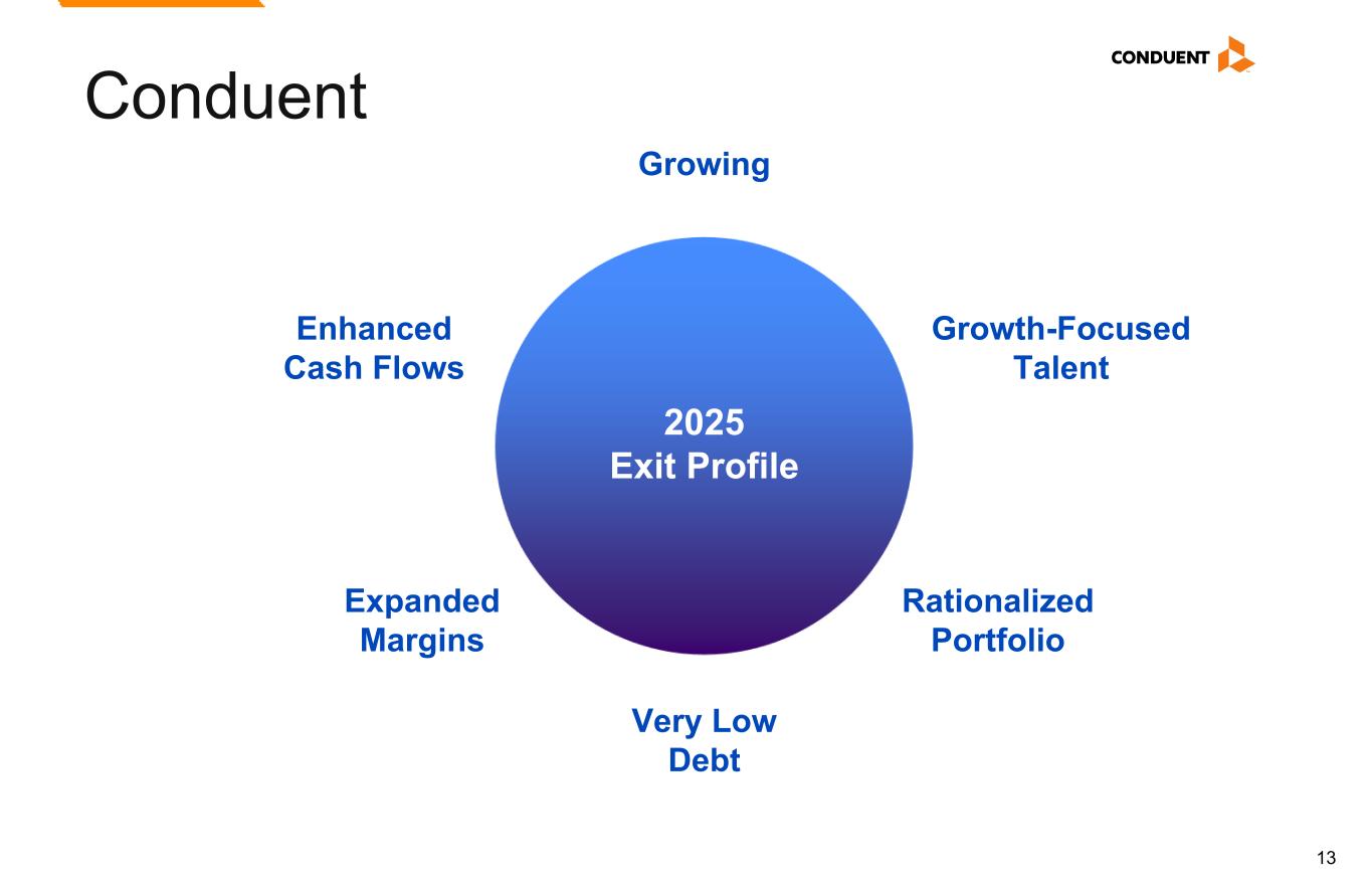 13 Conduent 2025 Exit Profile Rationalized Portfolio Growth-Focused Talent Enhanced Cash Flows Expanded Margins Growing Very Low Debt
