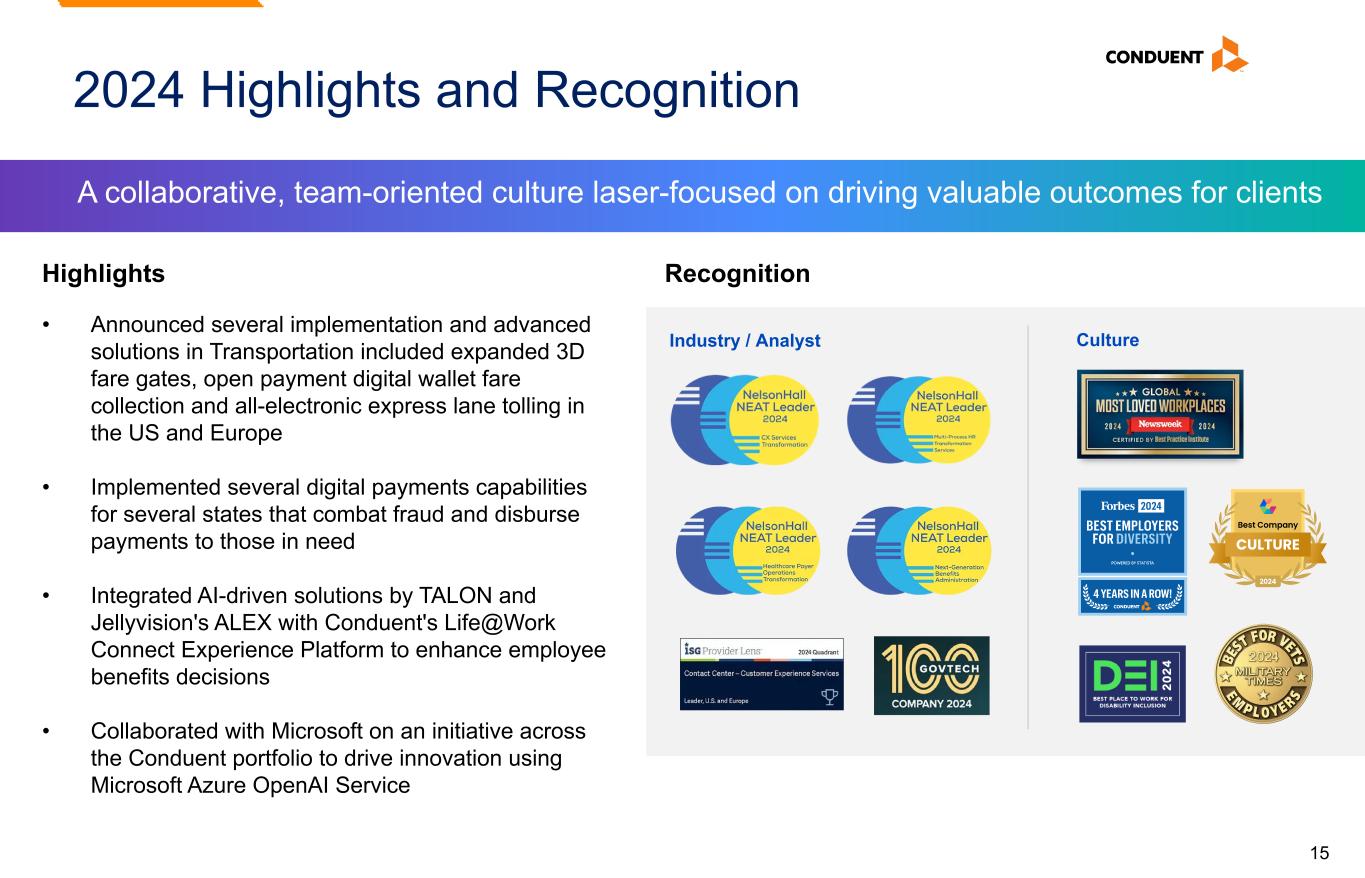 15 A collaborative, team-oriented culture laser-focused on driving valuable outcomes for clients 2024 Highlights and Recognition Highlights • Announced several implementation and advanced solutions in Transportation included expanded 3D fare gates, open payment digital wallet fare collection and all-electronic express lane tolling in the US and Europe • Implemented several digital payments capabilities for several states that combat fraud and disburse payments to those in need • Integrated AI-driven solutions by TALON and Jellyvision's ALEX with Conduent's Life@Work Connect Experience Platform to enhance employee benefits decisions • Collaborated with Microsoft on an initiative across the Conduent portfolio to drive innovation using Microsoft Azure OpenAI Service Recognition Industry / Analyst Culture
