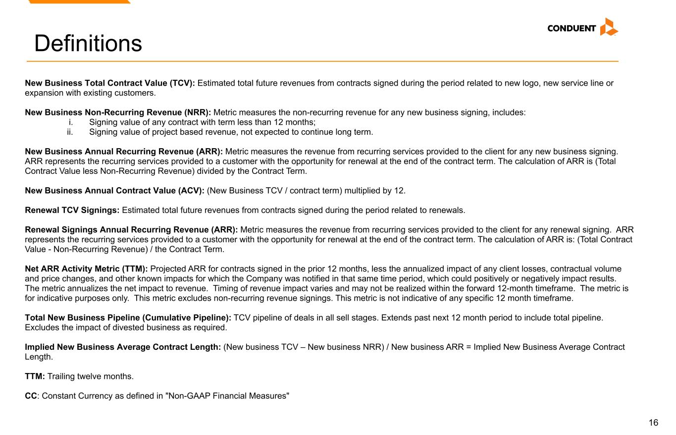 16 Definitions New Business Total Contract Value (TCV): Estimated total future revenues from contracts signed during the period related to new logo, new service line or expansion with existing customers. New Business Non-Recurring Revenue (NRR): Metric measures the non-recurring revenue for any new business signing, includes: i. Signing value of any contract with term less than 12 months; ii. Signing value of project based revenue, not expected to continue long term. New Business Annual Recurring Revenue (ARR): Metric measures the revenue from recurring services provided to the client for any new business signing. ARR represents the recurring services provided to a customer with the opportunity for renewal at the end of the contract term. The calculation of ARR is (Total Contract Value less Non-Recurring Revenue) divided by the Contract Term. New Business Annual Contract Value (ACV): (New Business TCV / contract term) multiplied by 12. Renewal TCV Signings: Estimated total future revenues from contracts signed during the period related to renewals. Renewal Signings Annual Recurring Revenue (ARR): Metric measures the revenue from recurring services provided to the client for any renewal signing. ARR represents the recurring services provided to a customer with the opportunity for renewal at the end of the contract term. The calculation of ARR is: (Total Contract Value - Non-Recurring Revenue) / the Contract Term. Net ARR Activity Metric (TTM): Projected ARR for contracts signed in the prior 12 months, less the annualized impact of any client losses, contractual volume and price changes, and other known impacts for which the Company was notified in that same time period, which could positively or negatively impact results. The metric annualizes the net impact to revenue. Timing of revenue impact varies and may not be realized within the forward 12-month timeframe. The metric is for indicative purposes only. This metric excludes non-recurring revenue signings. This metric is not indicative of any specific 12 month timeframe. Total New Business Pipeline (Cumulative Pipeline): TCV pipeline of deals in all sell stages. Extends past next 12 month period to include total pipeline. Excludes the impact of divested business as required. Implied New Business Average Contract Length: (New business TCV – New business NRR) / New business ARR = Implied New Business Average Contract Length. TTM: Trailing twelve months. CC: Constant Currency as defined in "Non-GAAP Financial Measures"