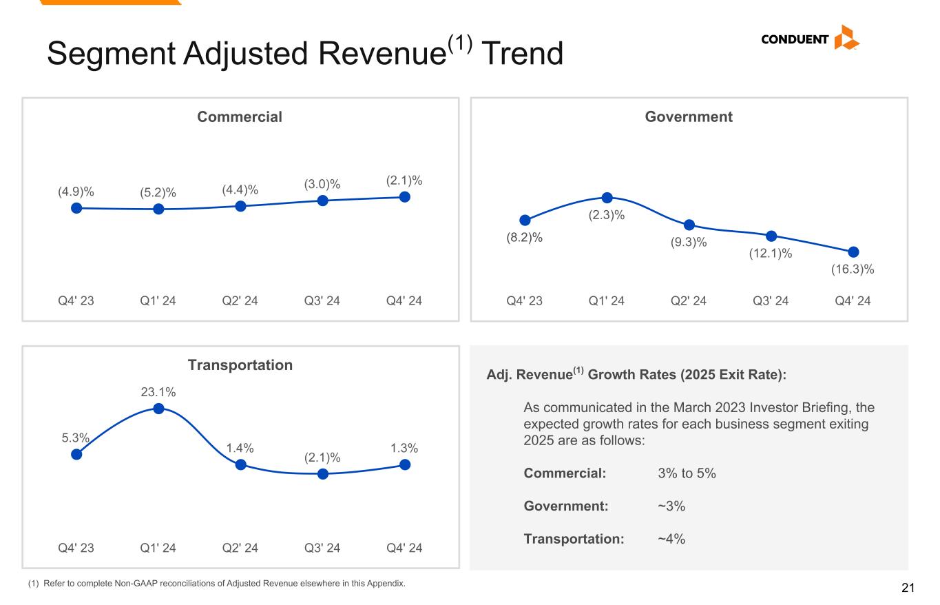 21 Government (8.2)% (2.3)% (9.3)% (12.1)% (16.3)% Q4' 23 Q1' 24 Q2' 24 Q3' 24 Q4' 24 Transportation 5.3% 23.1% 1.4% (2.1)% 1.3% Q4' 23 Q1' 24 Q2' 24 Q3' 24 Q4' 24 Commercial (4.9)% (5.2)% (4.4)% (3.0)% (2.1)% Q4' 23 Q1' 24 Q2' 24 Q3' 24 Q4' 24 Segment Adjusted Revenue(1) Trend Adj. Revenue(1) Growth Rates (2025 Exit Rate): As communicated in the March 2023 Investor Briefing, the expected growth rates for each business segment exiting 2025 are as follows: Commercial: 3% to 5% Government: ~3% Transportation: ~4% (1) Refer to complete Non-GAAP reconciliations of Adjusted Revenue elsewhere in this Appendix.