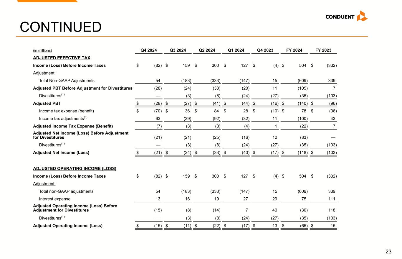 22 Non-GAAP Reconciliations (in millions) Q4 2024 Q3 2024 Q2 2024 Q1 2024 Q4 2023 FY 2024 FY 2023 REVENUE Revenue $ 800 $ 807 $ 828 $ 921 $ 953 $ 3,356 $ 3,722 Adjustment: Divestitures(1) — (26) (54) (100) (102) (180) (402) Adjusted Revenue 800 781 774 821 851 3,176 3,320 Foreign currency impact 2 — 1 (2) (5) 1 (12) Revenue at Constant Currency $ 802 $ 781 $ 775 $ 819 $ 846 $ 3,177 $ 3,308 ADJUSTED NET INCOME (LOSS) Income (Loss) From Continuing Operations $ (12) $ 123 $ 216 $ 99 $ 6 $ 426 $ (296) Adjustments: Amortization of acquired intangible assets(2) 1 1 2 1 2 5 7 Restructuring and related costs 25 4 8 9 13 46 62 Loss on extinguishment of debt 2 1 3 2 — 8 — Goodwill impairment 28 — — — — 28 287 (Gain) loss on divestitures and transaction costs, net — (188) (347) (161) 2 (696) 10 Litigation settlements (recoveries), net 3 1 1 4 (8) 9 (30) Other charges (credits) (5) (2) — (2) 6 (9) 3 Total Non-GAAP Adjustments 54 (183) (333) (147) 15 (609) 339 Income tax adjustments(3) (63) 39 92 32 (11) 100 (43) Adjusted Net Income (Loss) Before Adjustment for Divestitures (21) (21) (25) (16) 10 (83) — Divestitures(1) $ — $ (3) $ (8) $ (24) $ (27) $ (35) $ (103) Adjusted Net Income (Loss) $ (21) $ (24) $ (33) $ (40) $ (17) $ (118) $ (103) Adjusted Revenue, Revenue at Constant Currency, Adjusted Net Income (Loss), Adjusted Effective Tax Rate, Adjusted Operating Income (Loss) and Adjusted EBITDA (see footnotes on last page of Non-GAAP reconciliations)