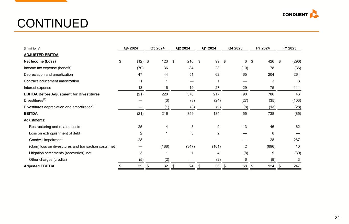 24 (in millions) Q4 2024 Q3 2024 Q2 2024 Q1 2024 Q4 2023 FY 2024 FY 2023 ADJUSTED EBITDA Net Income (Loss) $ (12) $ 123 $ 216 $ 99 $ 6 $ 426 $ (296) Income tax expense (benefit) (70) 36 84 28 (10) 78 (36) Depreciation and amortization 47 44 51 62 65 204 264 Contract inducement amortization 1 1 — 1 — 3 3 Interest expense 13 16 19 27 29 75 111 EBITDA Before Adjustment for Divestitures (21) 220 370 217 90 786 46 Divestitures(1) — (3) (8) (24) (27) (35) (103) Divestitures depreciation and amortization(1) — (1) (3) (9) (8) (13) (28) EBITDA (21) 216 359 184 55 738 (85) Adjustments: Restructuring and related costs 25 4 8 9 13 46 62 Loss on extinguishment of debt 2 1 3 2 — 8 — Goodwill impairment 28 — — — — 28 287 (Gain) loss on divestitures and transaction costs, net — (188) (347) (161) 2 (696) 10 Litigation settlements (recoveries), net 3 1 1 4 (8) 9 (30) Other charges (credits) (5) (2) — (2) 6 (9) 3 Adjusted EBITDA $ 32 $ 32 $ 24 $ 36 $ 68 $ 124 $ 247 CONTINUED