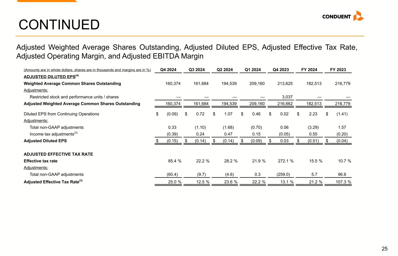 25 CONTINUED (Amounts are in whole dollars, shares are in thousands and margins are in %) Q4 2024 Q3 2024 Q2 2024 Q1 2024 Q4 2023 FY 2024 FY 2023 ADJUSTED DILUTED EPS(4) Weighted Average Common Shares Outstanding 160,374 161,684 194,539 209,160 213,625 182,513 216,779 Adjustments: Restricted stock and performance units / shares — — — — 3,037 — — Adjusted Weighted Average Common Shares Outstanding 160,374 161,684 194,539 209,160 216,662 182,513 216,779 Diluted EPS from Continuing Operations $ (0.09) $ 0.72 $ 1.07 $ 0.46 $ 0.02 $ 2.23 $ (1.41) Adjustments: Total non-GAAP adjustments 0.33 (1.10) (1.68) (0.70) 0.06 (3.29) 1.57 Income tax adjustments(3) (0.39) 0.24 0.47 0.15 (0.05) 0.55 (0.20) Adjusted Diluted EPS $ (0.15) $ (0.14) $ (0.14) $ (0.09) $ 0.03 $ (0.51) $ (0.04) ADJUSTED EFFECTIVE TAX RATE Effective tax rate 85.4 % 22.2 % 28.2 % 21.9 % 272.1 % 15.5 % 10.7 % Adjustments: Total non-GAAP adjustments (60.4) (9.7) (4.6) 0.3 (259.0) 5.7 96.6 Adjusted Effective Tax Rate(3) 25.0 % 12.5 % 23.6 % 22.2 % 13.1 % 21.2 % 107.3 % Adjusted Weighted Average Shares Outstanding, Adjusted Diluted EPS, Adjusted Effective Tax Rate, Adjusted Operating Margin, and Adjusted EBITDA Margin