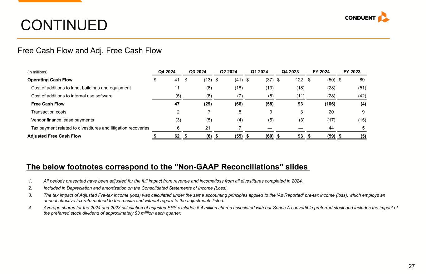 26 (Margins are in %) Q4 2024 Q3 2024 Q2 2024 Q1 2024 Q4 2023 FY 2024 FY 2023 ADJUSTED OPERATING MARGIN Income (Loss) Before Income Taxes Margin (10.3) % 19.7 % 36.2 % 13.8 % (0.4) % 15.0 % (8.9) % Adjustments: Total non-GAAP adjustments 6.8 (22.7) (40.2) (15.9) 1.6 (18.1) 9.1 Interest expense 1.6 2.0 2.3 2.9 3.0 2.2 3.0 Margin for Adjusted Operating Income Before Adjustment for Divestitures (1.9) (1.0) (1.7) 0.8 4.2 (0.9) 3.2 Divestitures(1) — (0.4) (1.1) (2.9) (2.7) (1.1) (2.7) Margin for Adjusted Operating Income (1.9) % (1.4) % (2.8) % (2.1) % 1.5 % (2.0) % 0.5 % ADJUSTED EBITDA MARGIN EBITDA Margin Before Adjustment for Divestitures (2.6) % 27.3 % 44.7 % 23.6 % 9.4 % 23.4 % 1.2 % Divestitures(1) — 0.4 1.7 (1.2) (2.9) (0.2) (3.8) EBITDA Margin (2.6) 27.7 46.4 22.4 6.5 23.2 (2.6) Total non-GAAP adjustments 6.6 (22.8) (40.5) (16.1) 1.4 (18.3) 9.0 Divestitures(1) — (0.4) (1.7) 1.2 2.9 0.2 3.8 Adjusted EBITDA Margin Before Adjustment for Divestitures 4.0 4.5 4.2 7.5 10.8 5.1 10.2 Divestitures(1) — (0.4) (1.1) (3.1) (2.8) (1.2) (2.8) Adjusted EBITDA Margin 4.0 % 4.1 % 3.1 % 4.4 % 8.0 % 3.9 % 7.4 % CONTINUED