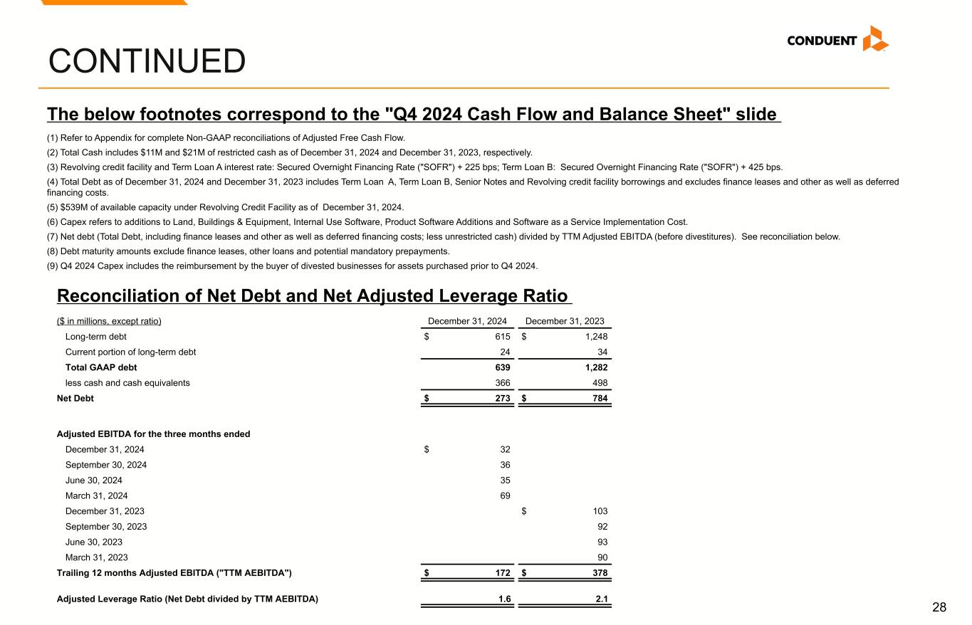 27 CONTINUED (in millions) Q4 2024 Q3 2024 Q2 2024 Q1 2024 Q4 2023 FY 2024 FY 2023 Operating Cash Flow $ 41 $ (13) $ (41) $ (37) $ 122 $ (50) $ 89 Cost of additions to land, buildings and equipment 11 (8) (18) (13) (18) (28) (51) Cost of additions to internal use software (5) (8) (7) (8) (11) (28) (42) Free Cash Flow 47 (29) (66) (58) 93 (106) (4) Transaction costs 2 7 8 3 3 20 9 Vendor finance lease payments (3) (5) (4) (5) (3) (17) (15) Tax payment related to divestitures and litigation recoveries 16 21 7 — — 44 5 Adjusted Free Cash Flow $ 62 $ (6) $ (55) $ (60) $ 93 $ (59) $ (5) Free Cash Flow and Adj. Free Cash Flow The below footnotes correspond to the "Non-GAAP Reconciliations" slides 1. All periods presented have been adjusted for the full impact from revenue and income/loss from all divestitures completed in 2024. 2. Included in Depreciation and amortization on the Consolidated Statements of Income (Loss). 3. The tax impact of Adjusted Pre-tax income (loss) was calculated under the same accounting principles applied to the 'As Reported' pre-tax income (loss), which employs an annual effective tax rate method to the results and without regard to the adjustments listed. 4. Average shares for the 2024 and 2023 calculation of adjusted EPS excludes 5.4 million shares associated with our Series A convertible preferred stock and includes the impact of the preferred stock dividend of approximately $3 million each quarter.