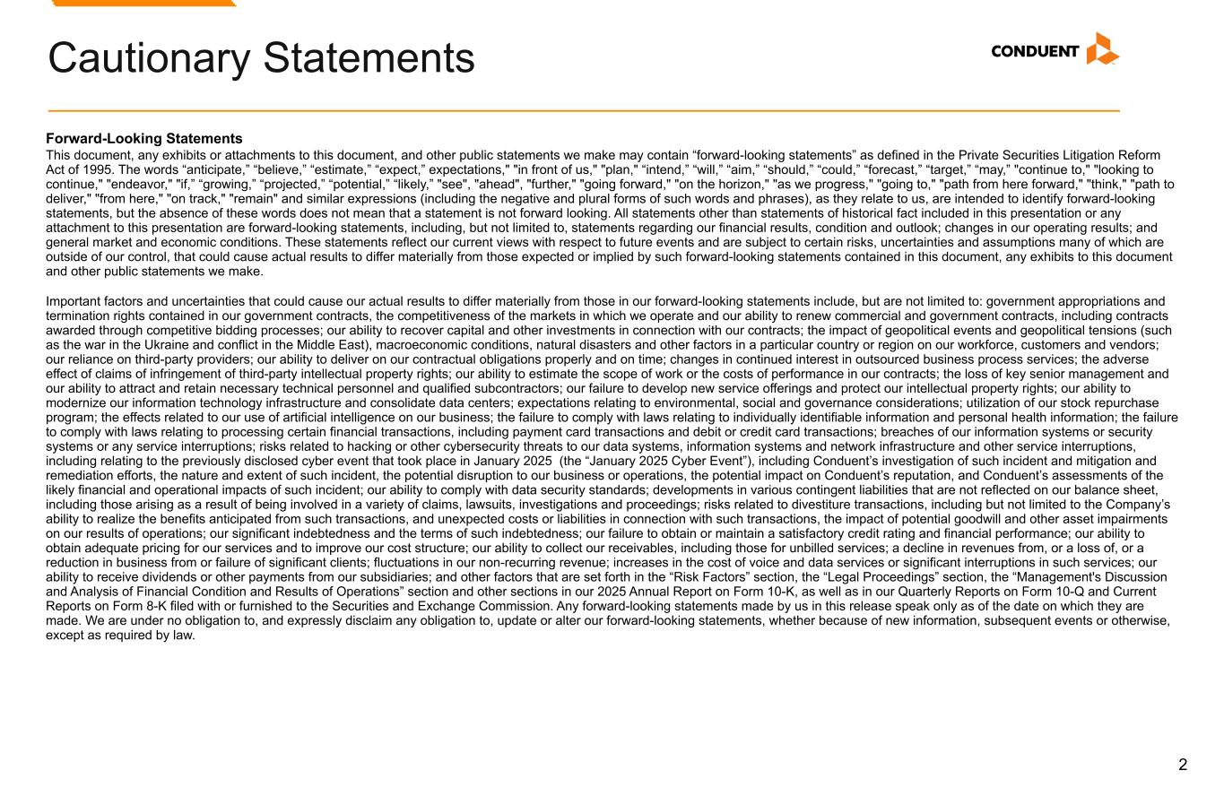 2 Forward-Looking Statements This document, any exhibits or attachments to this document, and other public statements we make may contain “forward-looking statements” as defined in the Private Securities Litigation Reform Act of 1995. The words “anticipate,” “believe,” “estimate,” “expect,” expectations," "in front of us," "plan," “intend,” “will,” “aim,” “should,” “could,” “forecast,” “target,” “may,” "continue to," "looking to continue," "endeavor," "if,” “growing,” “projected,” “potential,” “likely,” "see", "ahead", "further," "going forward," "on the horizon," "as we progress," "going to," "path from here forward," "think," "path to deliver," "from here," "on track," "remain" and similar expressions (including the negative and plural forms of such words and phrases), as they relate to us, are intended to identify forward-looking statements, but the absence of these words does not mean that a statement is not forward looking. All statements other than statements of historical fact included in this presentation or any attachment to this presentation are forward-looking statements, including, but not limited to, statements regarding our financial results, condition and outlook; changes in our operating results; and general market and economic conditions. These statements reflect our current views with respect to future events and are subject to certain risks, uncertainties and assumptions many of which are outside of our control, that could cause actual results to differ materially from those expected or implied by such forward-looking statements contained in this document, any exhibits to this document and other public statements we make. Important factors and uncertainties that could cause our actual results to differ materially from those in our forward-looking statements include, but are not limited to: government appropriations and termination rights contained in our government contracts, the competitiveness of the markets in which we operate and our ability to renew commercial and government contracts, including contracts awarded through competitive bidding processes; our ability to recover capital and other investments in connection with our contracts; the impact of geopolitical events and geopolitical tensions (such as the war in the Ukraine and conflict in the Middle East), macroeconomic conditions, natural disasters and other factors in a particular country or region on our workforce, customers and vendors; our reliance on third-party providers; our ability to deliver on our contractual obligations properly and on time; changes in continued interest in outsourced business process services; the adverse effect of claims of infringement of third-party intellectual property rights; our ability to estimate the scope of work or the costs of performance in our contracts; the loss of key senior management and our ability to attract and retain necessary technical personnel and qualified subcontractors; our failure to develop new service offerings and protect our intellectual property rights; our ability to modernize our information technology infrastructure and consolidate data centers; expectations relating to environmental, social and governance considerations; utilization of our stock repurchase program; the effects related to our use of artificial intelligence on our business; the failure to comply with laws relating to individually identifiable information and personal health information; the failure to comply with laws relating to processing certain financial transactions, including payment card transactions and debit or credit card transactions; breaches of our information systems or security systems or any service interruptions; risks related to hacking or other cybersecurity threats to our data systems, information systems and network infrastructure and other service interruptions, including relating to the previously disclosed cyber event that took place in January 2025 (the “January 2025 Cyber Event”), including Conduent’s investigation of such incident and mitigation and remediation efforts, the nature and extent of such incident, the potential disruption to our business or operations, the potential impact on Conduent’s reputation, and Conduent’s assessments of the likely financial and operational impacts of such incident; our ability to comply with data security standards; developments in various contingent liabilities that are not reflected on our balance sheet, including those arising as a result of being involved in a variety of claims, lawsuits, investigations and proceedings; risks related to divestiture transactions, including but not limited to the Company’s ability to realize the benefits anticipated from such transactions, and unexpected costs or liabilities in connection with such transactions, the impact of potential goodwill and other asset impairments on our results of operations; our significant indebtedness and the terms of such indebtedness; our failure to obtain or maintain a satisfactory credit rating and financial performance; our ability to obtain adequate pricing for our services and to improve our cost structure; our ability to collect our receivables, including those for unbilled services; a decline in revenues from, or a loss of, or a reduction in business from or failure of significant clients; fluctuations in our non-recurring revenue; increases in the cost of voice and data services or significant interruptions in such services; our ability to receive dividends or other payments from our subsidiaries; and other factors that are set forth in the “Risk Factors” section, the “Legal Proceedings” section, the “Management's Discussion and Analysis of Financial Condition and Results of Operations” section and other sections in our 2025 Annual Report on Form 10-K, as well as in our Quarterly Reports on Form 10-Q and Current Reports on Form 8-K filed with or furn