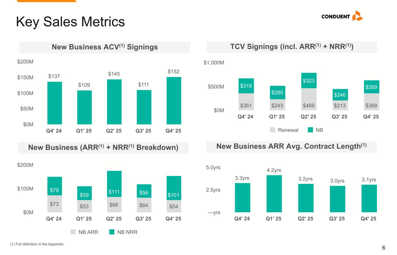 5 Key Sales Metrics New Business ACV(1) Full Year New Business ACV(1) by Segment (1) Full definition in the Appendix. $318 $269 $969 $1,118 Q4'24 Q4'25 FY'24 FY'25 $0M $500M $1,000M $1,500M New Business TCV(1) $73 $54 $228 $237 Q4'24 Q4'25 FY'24 FY'25 $0M $100M $200M $300M $213M $152M $152M Commercial Government Transportation $137 $152 $485 $517 Q4'24 Q4'25 FY'24 FY'25 $0M $250M $500M $750M New Business ARR(1) Trailing Four Quarters ACV(1) Sales Trend $485 $498 $502 $502 $517 $251 $263 $240 $223 $213 $101 $101 $122 $126 $152 $133 $134 $140 $153 $152 Conduent Total Commercial Government Transportation Q4' 24 Q1' 25 Q2' 25 Q3' 25 Q4' 25 $0 $200 $400 $600