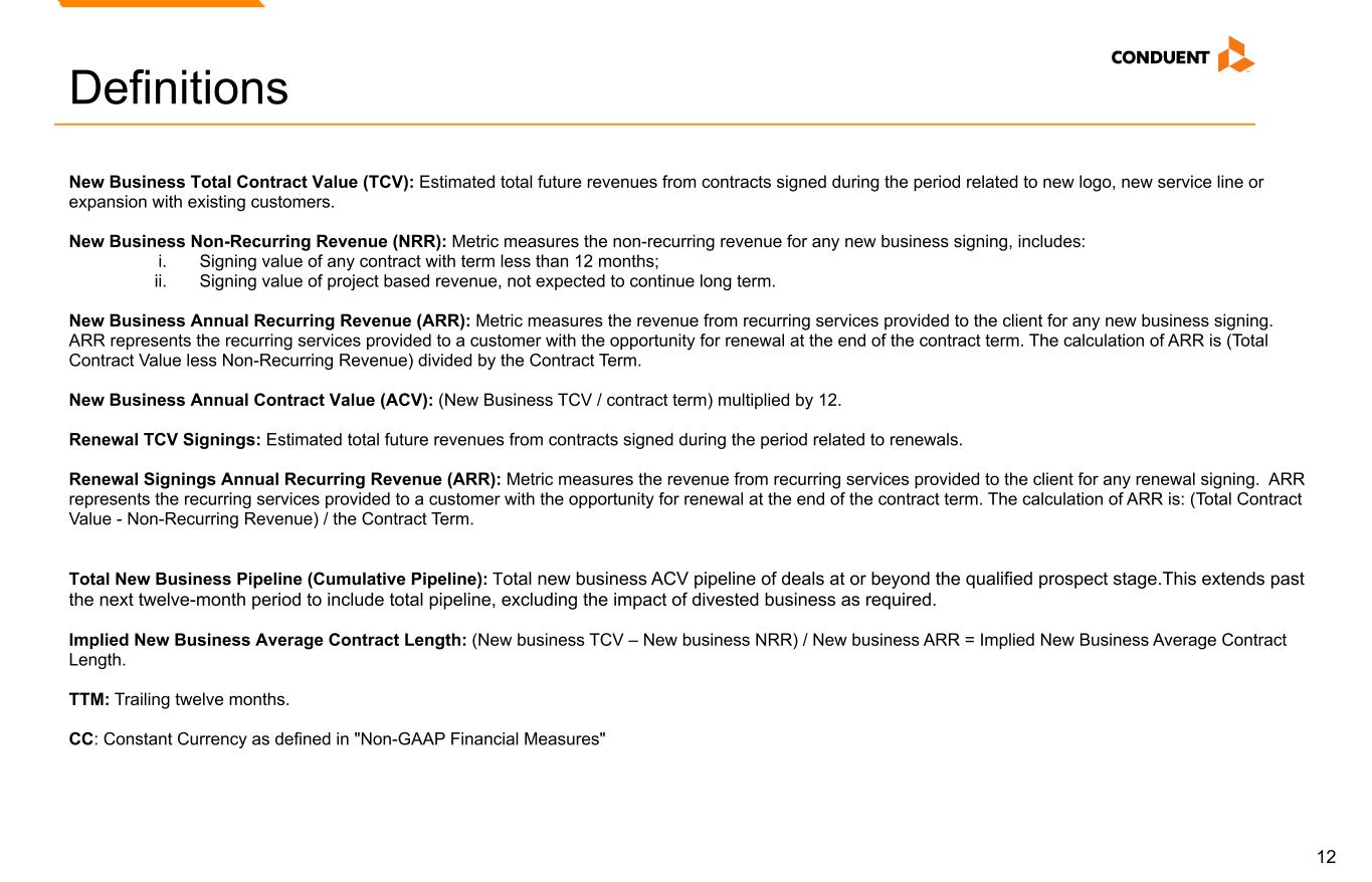 12 Definitions New Business Total Contract Value (TCV): Estimated total future revenues from contracts signed during the period related to new logo, new service line or expansion with existing customers. New Business Non-Recurring Revenue (NRR): Metric measures the non-recurring revenue for any new business signing, includes: i. Signing value of any contract with term less than 12 months; ii. Signing value of project based revenue, not expected to continue long term. New Business Annual Recurring Revenue (ARR): Metric measures the revenue from recurring services provided to the client for any new business signing. ARR represents the recurring services provided to a customer with the opportunity for renewal at the end of the contract term. The calculation of ARR is (Total Contract Value less Non-Recurring Revenue) divided by the Contract Term. New Business Annual Contract Value (ACV): (New Business TCV / contract term) multiplied by 12. Renewal TCV Signings: Estimated total future revenues from contracts signed during the period related to renewals. Renewal Signings Annual Recurring Revenue (ARR): Metric measures the revenue from recurring services provided to the client for any renewal signing. ARR represents the recurring services provided to a customer with the opportunity for renewal at the end of the contract term. The calculation of ARR is: (Total Contract Value - Non-Recurring Revenue) / the Contract Term. Total New Business Pipeline (Cumulative Pipeline): Total new business ACV pipeline of deals at or beyond the qualified prospect stage.This extends past the next twelve-month period to include total pipeline, excluding the impact of divested business as required. Implied New Business Average Contract Length: (New business TCV – New business NRR) / New business ARR = Implied New Business Average Contract Length. TTM: Trailing twelve months. CC: Constant Currency as defined in "Non-GAAP Financial Measures"