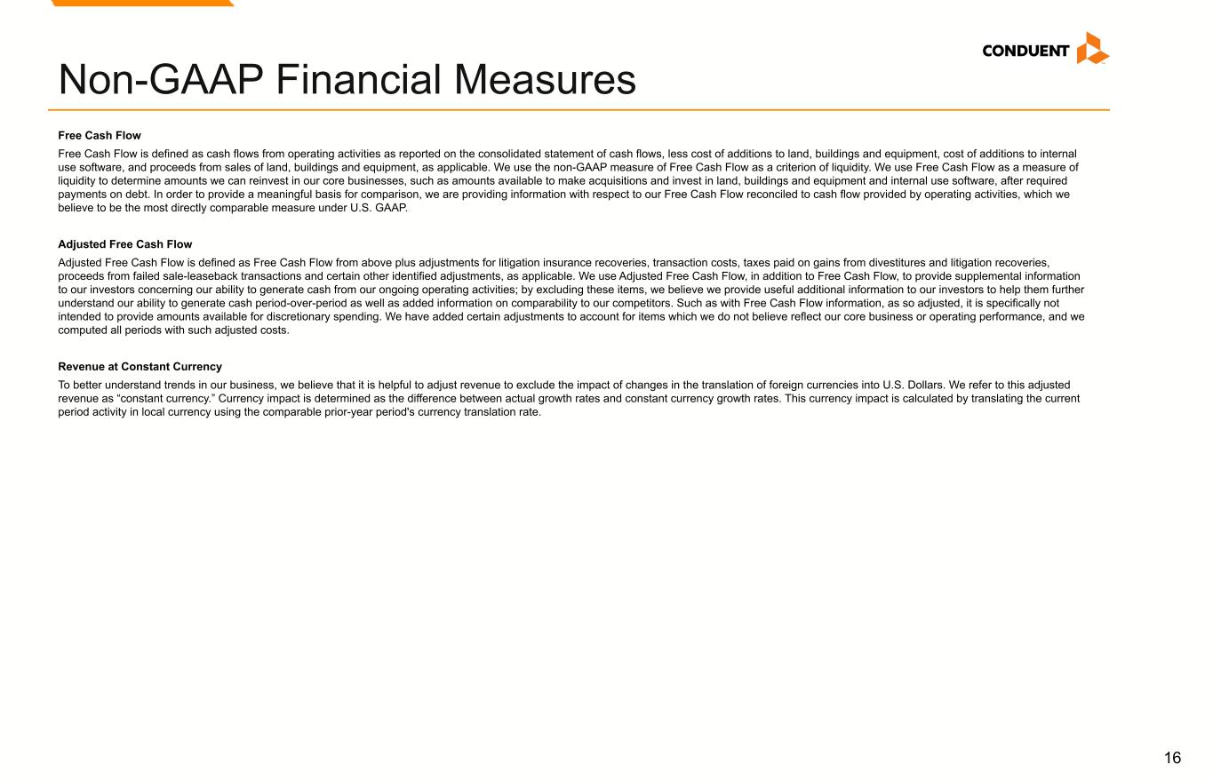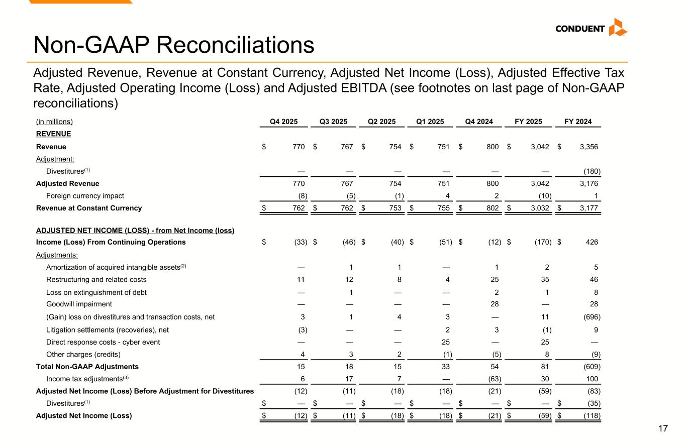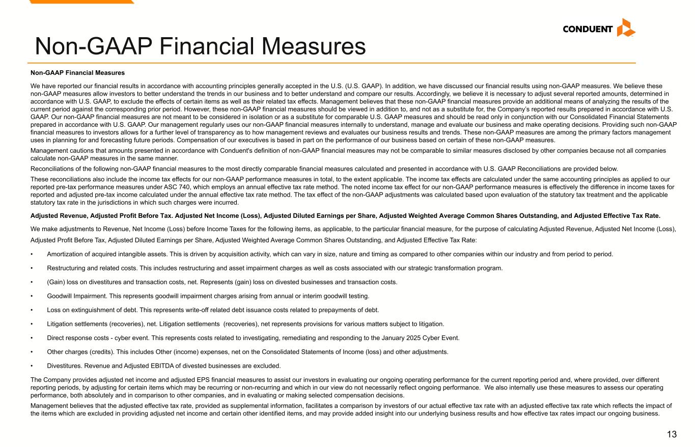 13 Non-GAAP Financial Measures We have reported our financial results in accordance with accounting principles generally accepted in the U.S. (U.S. GAAP). In addition, we have discussed our financial results using non-GAAP measures. We believe these non-GAAP measures allow investors to better understand the trends in our business and to better understand and compare our results. Accordingly, we believe it is necessary to adjust several reported amounts, determined in accordance with U.S. GAAP, to exclude the effects of certain items as well as their related tax effects. Management believes that these non-GAAP financial measures provide an additional means of analyzing the results of the current period against the corresponding prior period. However, these non-GAAP financial measures should be viewed in addition to, and not as a substitute for, the Company’s reported results prepared in accordance with U.S. GAAP. Our non-GAAP financial measures are not meant to be considered in isolation or as a substitute for comparable U.S. GAAP measures and should be read only in conjunction with our Consolidated Financial Statements prepared in accordance with U.S. GAAP. Our management regularly uses our non-GAAP financial measures internally to understand, manage and evaluate our business and make operating decisions. Providing such non-GAAP financial measures to investors allows for a further level of transparency as to how management reviews and evaluates our business results and trends. These non-GAAP measures are among the primary factors management uses in planning for and forecasting future periods. Compensation of our executives is based in part on the performance of our business based on certain of these non-GAAP measures. Management cautions that amounts presented in accordance with Conduent's definition of non-GAAP financial measures may not be comparable to similar measures disclosed by other companies because not all companies calculate non-GAAP measures in the same manner. Reconciliations of the following non-GAAP financial measures to the most directly comparable financial measures calculated and presented in accordance with U.S. GAAP Reconciliations are provided below. These reconciliations also include the income tax effects for our non-GAAP performance measures in total, to the extent applicable. The income tax effects are calculated under the same accounting principles as applied to our reported pre-tax performance measures under ASC 740, which employs an annual effective tax rate method. The noted income tax effect for our non-GAAP performance measures is effectively the difference in income taxes for reported and adjusted pre-tax income calculated under the annual effective tax rate method. The tax effect of the non-GAAP adjustments was calculated based upon evaluation of the statutory tax treatment and the applicable statutory tax rate in the jurisdictions in which such charges were incurred. Adjusted Revenue, Adjusted Profit Before Tax. Adjusted Net Income (Loss), Adjusted Diluted Earnings per Share, Adjusted Weighted Average Common Shares Outstanding, and Adjusted Effective Tax Rate. We make adjustments to Revenue, Net Income (Loss) before Income Taxes for the following items, as applicable, to the particular financial measure, for the purpose of calculating Adjusted Revenue, Adjusted Net Income (Loss), Adjusted Profit Before Tax, Adjusted Diluted Earnings per Share, Adjusted Weighted Average Common Shares Outstanding, and Adjusted Effective Tax Rate: • Amortization of acquired intangible assets. This is driven by acquisition activity, which can vary in size, nature and timing as compared to other companies within our industry and from period to period. • Restructuring and related costs. This includes restructuring and asset impairment charges as well as costs associated with our strategic transformation program. • (Gain) loss on divestitures and transaction costs, net. Represents (gain) loss on divested businesses and transaction costs. • Goodwill Impairment. This represents goodwill impairment charges arising from annual or interim goodwill testing. • Loss on extinguishment of debt. This represents write-off related debt issuance costs related to prepayments of debt. • Litigation settlements (recoveries), net. Litigation settlements (recoveries), net represents provisions for various matters subject to litigation. • Direct response costs - cyber event. This represents costs related to investigating, remediating and responding to the January 2025 Cyber Event. • Other charges (credits). This includes Other (income) expenses, net on the Consolidated Statements of Income (loss) and other adjustments. • Divestitures. Revenue and Adjusted EBITDA of divested businesses are excluded. The Company provides adjusted net income and adjusted EPS financial measures to assist our investors in evaluating our ongoing operating performance for the current reporting period and, where provided, over different reporting periods, by adjusting for certain items which may be recurring or non-recurring and which in our view do not necessarily reflect ongoing performance. We also internally use these measures to assess our operating performance, both absolutely and in comparison to other companies, and in evaluating or making selected compensation decisions. Management believes that the adjusted effective tax rate, provided as supplemental information, facilitates a comparison by investors of our actual effective tax rate with an adjusted effective tax rate which reflects the impact of the items which are excluded in providing adjusted net income and certain other identified items, and may provide added insight into our underlying business results and how effective tax rates impact our ongoing business. Non-GAAP Financial Measures