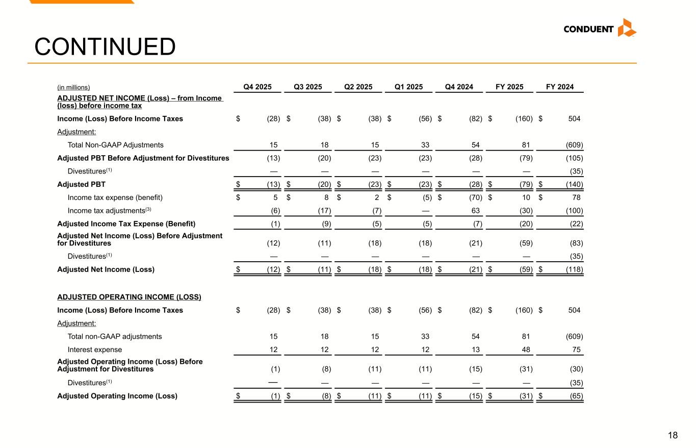 17 Non-GAAP Reconciliations (in millions) Q4 2025 Q3 2025 Q2 2025 Q1 2025 Q4 2024 FY 2025 FY 2024 REVENUE Revenue $ 770 $ 767 $ 754 $ 751 $ 800 $ 3,042 $ 3,356 Adjustment: Divestitures(1) — — — — — — (180) Adjusted Revenue 770 767 754 751 800 3,042 3,176 Foreign currency impact (8) (5) (1) 4 2 (10) 1 Revenue at Constant Currency $ 762 $ 762 $ 753 $ 755 $ 802 $ 3,032 $ 3,177 ADJUSTED NET INCOME (LOSS) - from Net Income (loss) Income (Loss) From Continuing Operations $ (33) $ (46) $ (40) $ (51) $ (12) $ (170) $ 426 Adjustments: Amortization of acquired intangible assets(2) — 1 1 — 1 2 5 Restructuring and related costs 11 12 8 4 25 35 46 Loss on extinguishment of debt — 1 — — 2 1 8 Goodwill impairment — — — — 28 — 28 (Gain) loss on divestitures and transaction costs, net 3 1 4 3 — 11 (696) Litigation settlements (recoveries), net (3) — — 2 3 (1) 9 Direct response costs - cyber event — — — 25 — 25 — Other charges (credits) 4 3 2 (1) (5) 8 (9) Total Non-GAAP Adjustments 15 18 15 33 54 81 (609) Income tax adjustments(3) 6 17 7 — (63) 30 100 Adjusted Net Income (Loss) Before Adjustment for Divestitures (12) (11) (18) (18) (21) (59) (83) Divestitures(1) $ — $ — $ — $ — $ — $ — $ (35) Adjusted Net Income (Loss) $ (12) $ (11) $ (18) $ (18) $ (21) $ (59) $ (118) Adjusted Revenue, Revenue at Constant Currency, Adjusted Net Income (Loss), Adjusted Effective Tax Rate, Adjusted Operating Income (Loss) and Adjusted EBITDA (see footnotes on last page of Non-GAAP reconciliations)