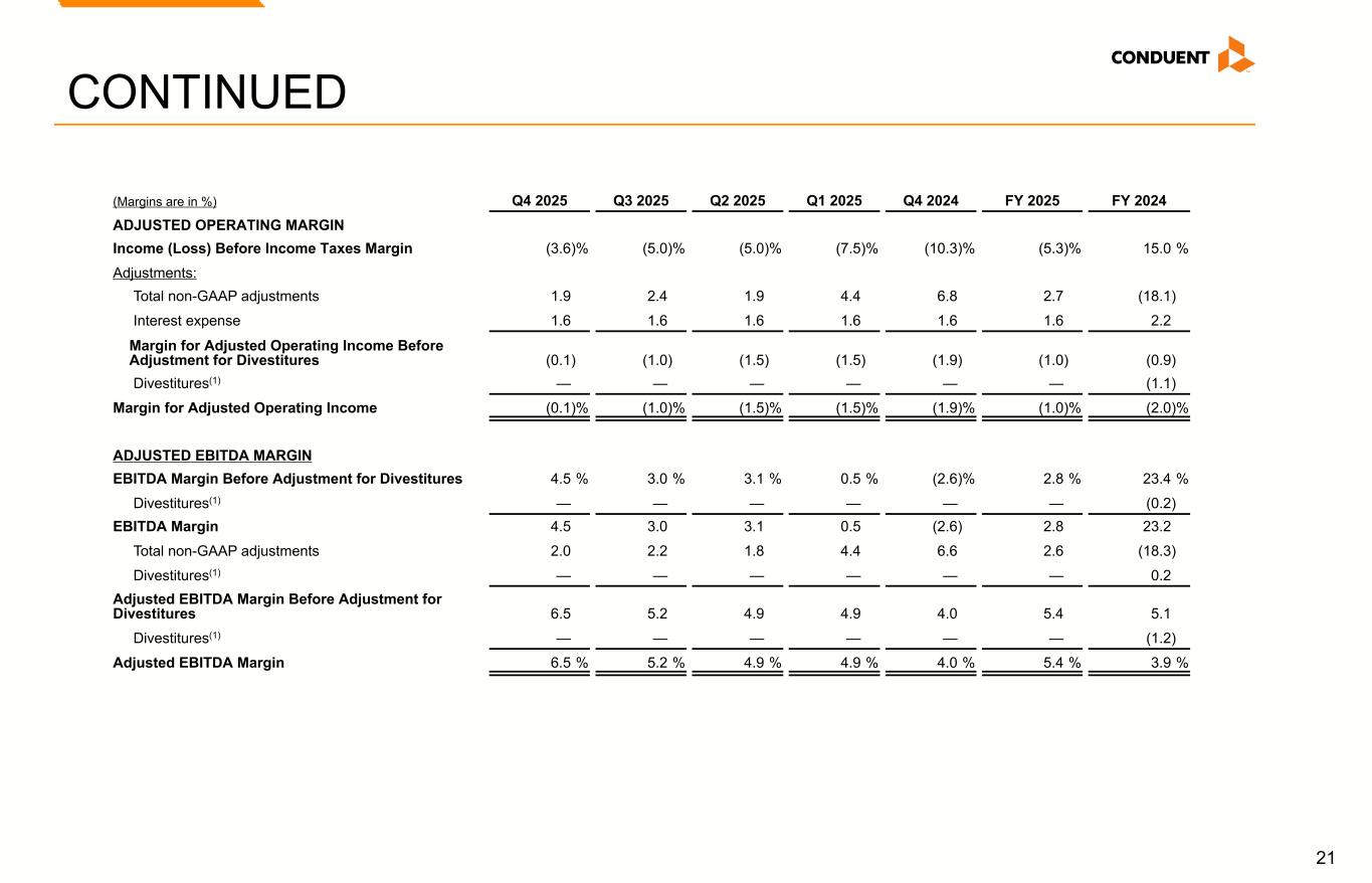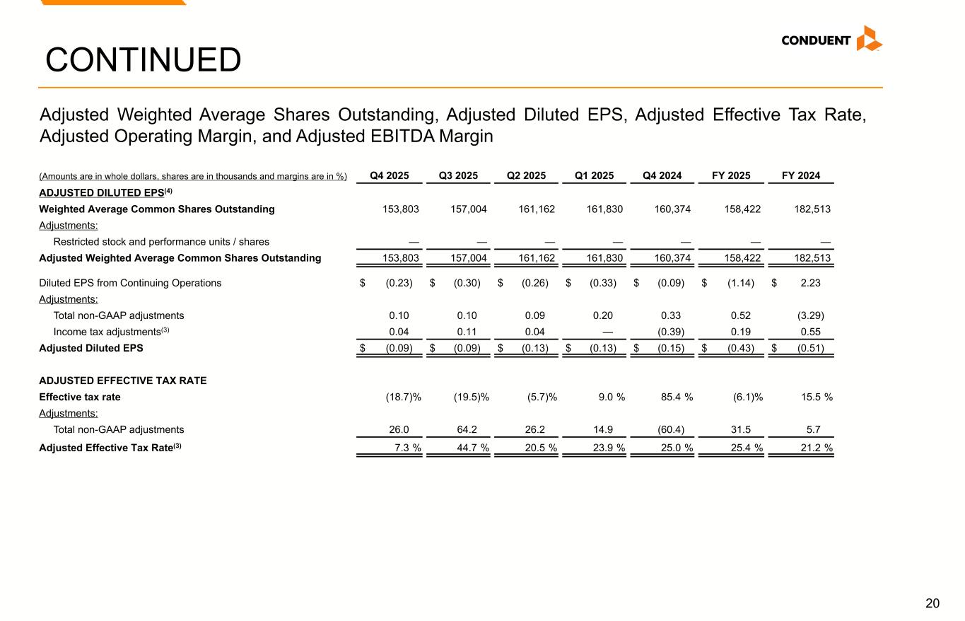 20 CONTINUED (Amounts are in whole dollars, shares are in thousands and margins are in %) Q4 2025 Q3 2025 Q2 2025 Q1 2025 Q4 2024 FY 2025 FY 2024 ADJUSTED DILUTED EPS(4) Weighted Average Common Shares Outstanding 153,803 157,004 161,162 161,830 160,374 158,422 182,513 Adjustments: Restricted stock and performance units / shares — — — — — — — Adjusted Weighted Average Common Shares Outstanding 153,803 157,004 161,162 161,830 160,374 158,422 182,513 Diluted EPS from Continuing Operations $ (0.23) $ (0.30) $ (0.26) $ (0.33) $ (0.09) $ (1.14) $ 2.23 Adjustments: Total non-GAAP adjustments 0.10 0.10 0.09 0.20 0.33 0.52 (3.29) Income tax adjustments(3) 0.04 0.11 0.04 — (0.39) 0.19 0.55 Adjusted Diluted EPS $ (0.09) $ (0.09) $ (0.13) $ (0.13) $ (0.15) $ (0.43) $ (0.51) ADJUSTED EFFECTIVE TAX RATE Effective tax rate (18.7) % (19.5) % (5.7) % 9.0 % 85.4 % (6.1) % 15.5 % Adjustments: Total non-GAAP adjustments 26.0 64.2 26.2 14.9 (60.4) 31.5 5.7 Adjusted Effective Tax Rate(3) 7.3 % 44.7 % 20.5 % 23.9 % 25.0 % 25.4 % 21.2 % Adjusted Weighted Average Shares Outstanding, Adjusted Diluted EPS, Adjusted Effective Tax Rate, Adjusted Operating Margin, and Adjusted EBITDA Margin