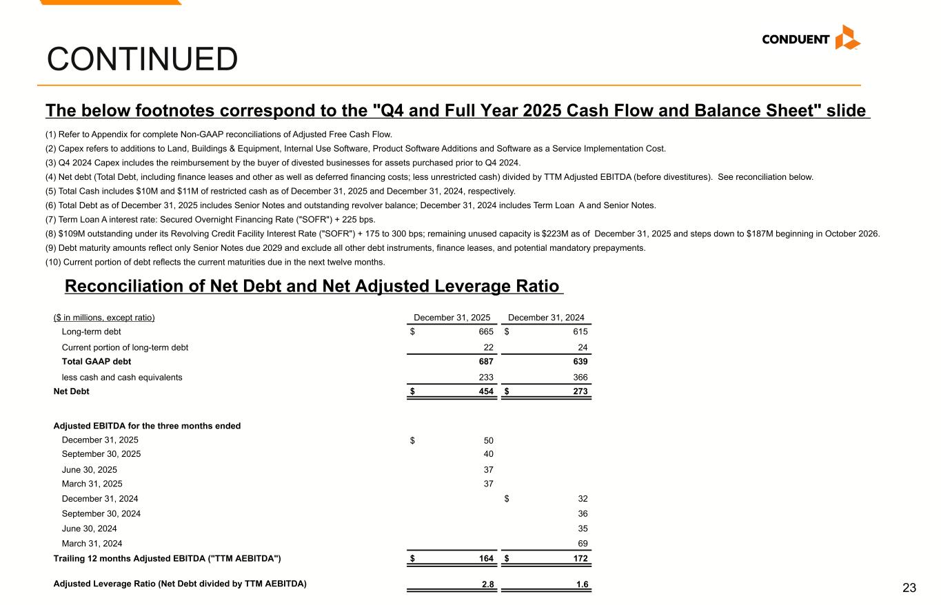 23 CONTINUED ($ in millions, except ratio) December 31, 2025 December 31, 2024 Long-term debt $ 665 $ 615 Current portion of long-term debt 22 24 Total GAAP debt 687 639 less cash and cash equivalents 233 366 Net Debt $ 454 $ 273 Adjusted EBITDA for the three months ended December 31, 2025 $ 50 September 30, 2025 40 June 30, 2025 37 March 31, 2025 37 December 31, 2024 $ 32 September 30, 2024 36 June 30, 2024 35 March 31, 2024 69 Trailing 12 months Adjusted EBITDA ("TTM AEBITDA") $ 164 $ 172 Adjusted Leverage Ratio (Net Debt divided by TTM AEBITDA) 2.8 1.6 (1) Refer to Appendix for complete Non-GAAP reconciliations of Adjusted Free Cash Flow. (2) Capex refers to additions to Land, Buildings & Equipment, Internal Use Software, Product Software Additions and Software as a Service Implementation Cost. (3) Q4 2024 Capex includes the reimbursement by the buyer of divested businesses for assets purchased prior to Q4 2024. (4) Net debt (Total Debt, including finance leases and other as well as deferred financing costs; less unrestricted cash) divided by TTM Adjusted EBITDA (before divestitures). See reconciliation below. (5) Total Cash includes $10M and $11M of restricted cash as of December 31, 2025 and December 31, 2024, respectively. (6) Total Debt as of December 31, 2025 includes Senior Notes and outstanding revolver balance; December 31, 2024 includes Term Loan A and Senior Notes. (7) Term Loan A interest rate: Secured Overnight Financing Rate ("SOFR") + 225 bps. (8) $109M outstanding under its Revolving Credit Facility Interest Rate ("SOFR") + 175 to 300 bps; remaining unused capacity is $223M as of December 31, 2025 and steps down to $187M beginning in October 2026. (9) Debt maturity amounts reflect only Senior Notes due 2029 and exclude all other debt instruments, finance leases, and potential mandatory prepayments. (10) Current portion of debt reflects the current maturities due in the next twelve months. The below footnotes correspond to the "Q4 and Full Year 2025 Cash Flow and Balance Sheet" slide Reconciliation of Net Debt and Net Adjusted Leverage Ratio