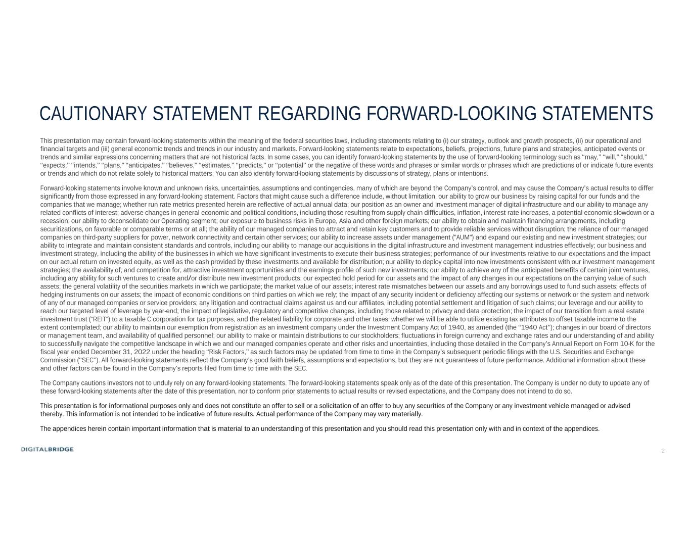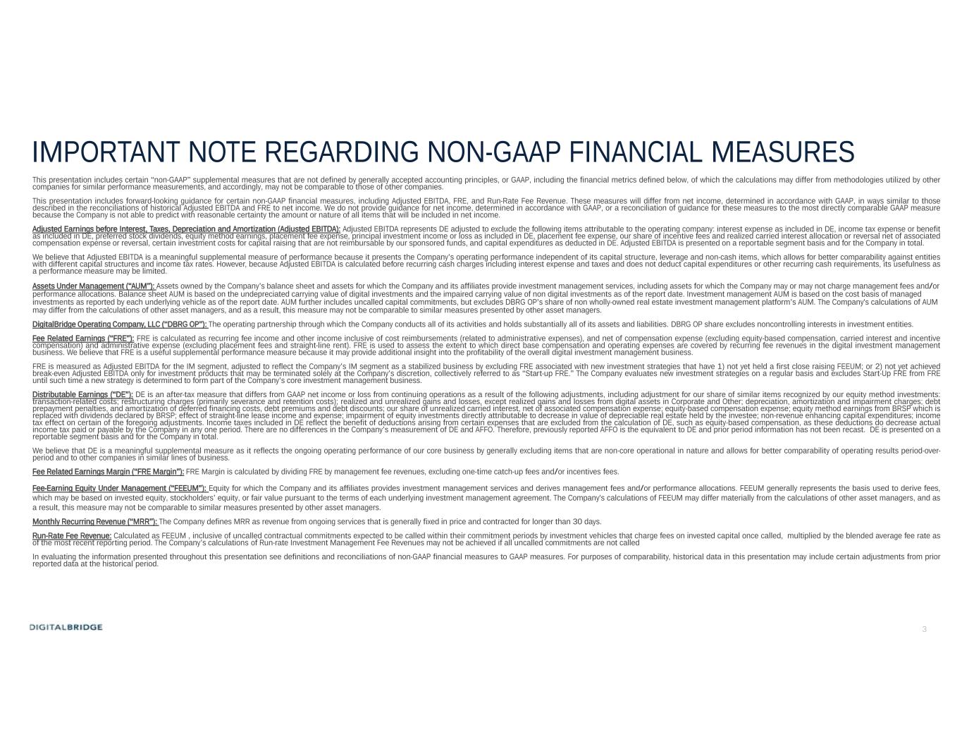 2 CAUTIONARY STATEMENT REGARDING FORWARD-LOOKING STATEMENTS This presentation may contain forward-looking statements within the meaning of the federal securities laws, including statements relating to (i) our strategy, outlook and growth prospects, (ii) our operational and financial targets and (iii) general economic trends and trends in our industry and markets. Forward-looking statements relate to expectations, beliefs, projections, future plans and strategies, anticipated events or trends and similar expressions concerning matters that are not historical facts. In some cases, you can identify forward-looking statements by the use of forward-looking terminology such as “may,” “will,” “should,” “expects,” “intends,” “plans,” “anticipates,” “believes,” “estimates,” “predicts,” or “potential” or the negative of these words and phrases or similar words or phrases which are predictions of or indicate future events or trends and which do not relate solely to historical matters. You can also identify forward-looking statements by discussions of strategy, plans or intentions. Forward-looking statements involve known and unknown risks, uncertainties, assumptions and contingencies, many of which are beyond the Company’s control, and may cause the Company’s actual results to differ significantly from those expressed in any forward-looking statement. Factors that might cause such a difference include, without limitation, our ability to grow our business by raising capital for our funds and the companies that we manage; whether run rate metrics presented herein are reflective of actual annual data; our position as an owner and investment manager of digital infrastructure and our ability to manage any related conflicts of interest; adverse changes in general economic and political conditions, including those resulting from supply chain difficulties, inflation, interest rate increases, a potential economic slowdown or a recession; our ability to deconsolidate our Operating segment; our exposure to business risks in Europe, Asia and other foreign markets; our ability to obtain and maintain financing arrangements, including securitizations, on favorable or comparable terms or at all; the ability of our managed companies to attract and retain key customers and to provide reliable services without disruption; the reliance of our managed companies on third-party suppliers for power, network connectivity and certain other services; our ability to increase assets under management ("AUM") and expand our existing and new investment strategies; our ability to integrate and maintain consistent standards and controls, including our ability to manage our acquisitions in the digital infrastructure and investment management industries effectively; our business and investment strategy, including the ability of the businesses in which we have significant investments to execute their business strategies; performance of our investments relative to our expectations and the impact on our actual return on invested equity, as well as the cash provided by these investments and available for distribution; our ability to deploy capital into new investments consistent with our investment management strategies; the availability of, and competition for, attractive investment opportunities and the earnings profile of such new investments; our ability to achieve any of the anticipated benefits of certain joint ventures, including any ability for such ventures to create and/or distribute new investment products; our expected hold period for our assets and the impact of any changes in our expectations on the carrying value of such assets; the general volatility of the securities markets in which we participate; the market value of our assets; interest rate mismatches between our assets and any borrowings used to fund such assets; effects of hedging instruments on our assets; the impact of economic conditions on third parties on which we rely; the impact of any security incident or deficiency affecting our systems or network or the system and network of any of our managed companies or service providers; any litigation and contractual claims against us and our affiliates, including potential settlement and litigation of such claims; our leverage and our ability to reach our targeted level of leverage by year-end; the impact of legislative, regulatory and competitive changes, including those related to privacy and data protection; the impact of our transition from a real estate investment trust ("REIT") to a taxable C corporation for tax purposes, and the related liability for corporate and other taxes; whether we will be able to utilize existing tax attributes to offset taxable income to the extent contemplated; our ability to maintain our exemption from registration as an investment company under the Investment Company Act of 1940, as amended (the “1940 Act”); changes in our board of directors or management team, and availability of qualified personnel; our ability to make or maintain distributions to our stockholders; fluctuations in foreign currency and exchange rates and our understanding of and ability to successfully navigate the competitive landscape in which we and our managed companies operate and other risks and uncertainties, including those detailed in the Company’s Annual Report on Form 10-K for the fiscal year ended December 31, 2022 under the heading “Risk Factors,” as such factors may be updated from time to time in the Company’s subsequent periodic filings with the U.S. Securities and Exchange Commission (“SEC”). All forward-looking statements reflect the Company’s good faith beliefs, assumptions and expectations, but they are not guarantees of future performance. Additional information about these and other factors can be found in the Company’s reports filed from time to time with the SEC. The Company cautions investors not to unduly rely on any forw