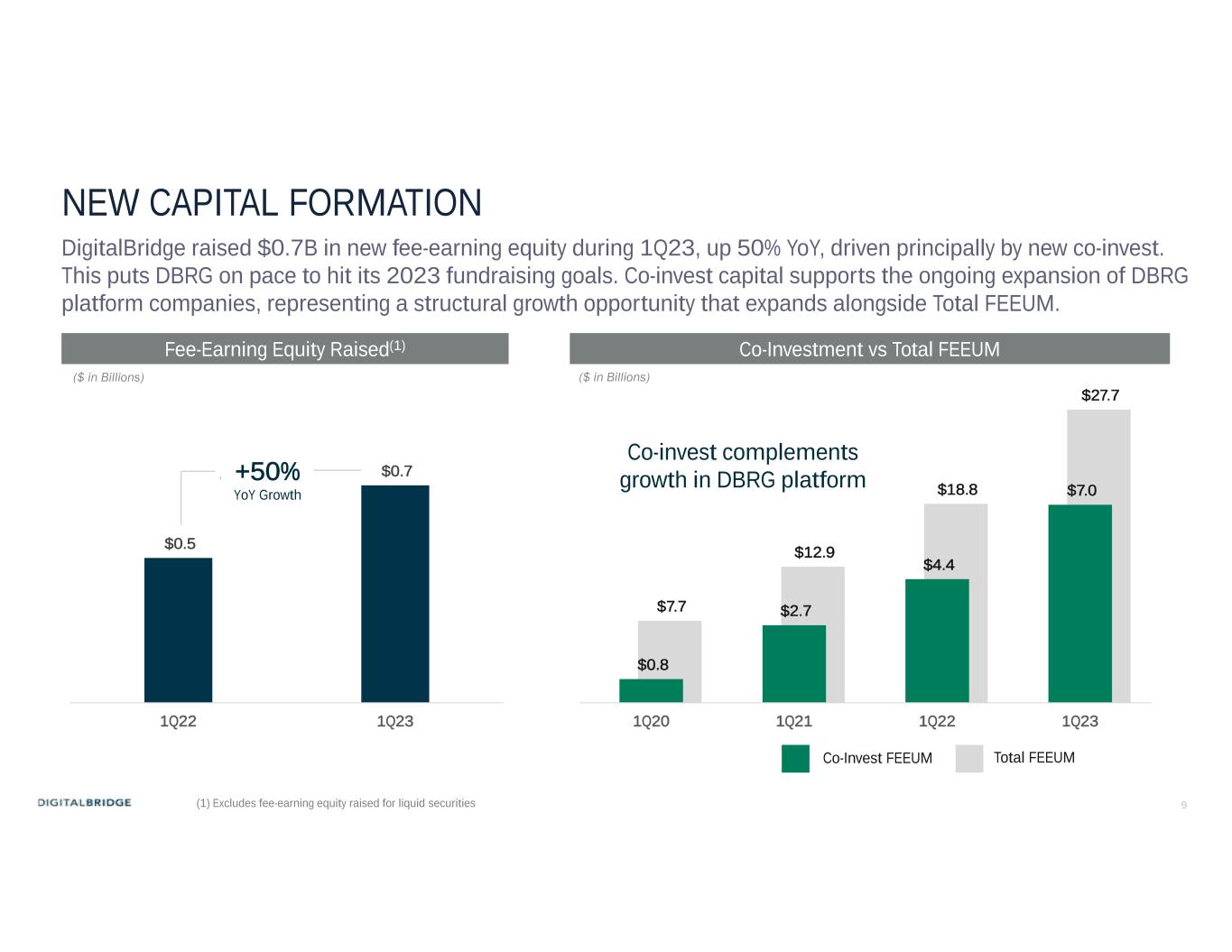 8 $19.9 $24.8 $29.1 $16.5 $16.9 $19.4 $7.1 $7.3 $7.7 $8.4 $1.0 $2.2 $3.0 $2.1 $1.5 $1.7 $46.6 $52.8 $69.3 1Q22 4Q22 1Q23 ASSETS & FEE EARNING EQUITY UNDER MANAGEMENT Fee-Earning Equity Under Management (FEEUM) increased $8.9B, or 47% YoY, driven equally by a combination of organic capital formation in co-invest, core and credit strategies and contribution from the InfraBridge acquisition DBP Series Co-Invest Permanent Capital Vehicles Core, Liquid, Credit Note: Past performance is not indicative of future results or indicative of how other DigitalBridge investments will perform. Please see slide 2 for additional information. AUM(1)FEEUM InfraBridge $11.0 $11.2 $11.2 $4.4 $6.5 $7.0 $5.1 $2.4 $2.5 $2.2 $1.0 $2.0 $2.2 $18.8 $22.2 $27.7 1Q22 4Q22 1Q23 +47% YoY Growth +49% YoY GrowthFEEUM growth is Key Revenue and Earnings Driver (1) See definition of AUM in Notes Regarding Non-GAAP Financial Measures, on page 3 of this presentation. DBRG Balance Sheet ($ in Billions) ($ in Billions)