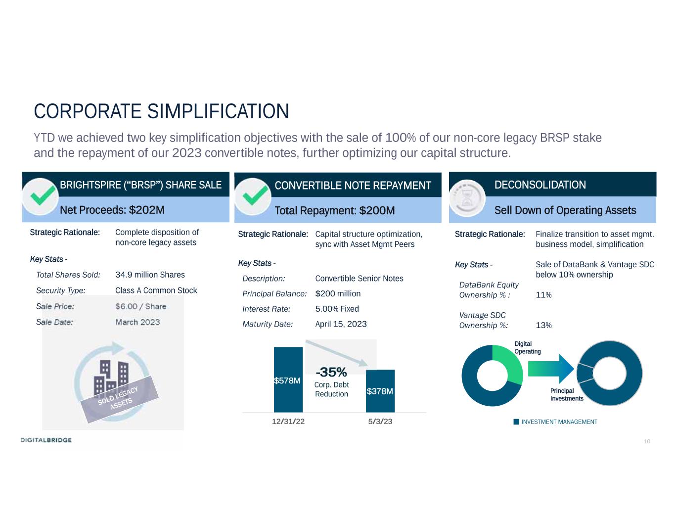10 CORPORATE SIMPLIFICATION YTD we achieved two key simplification objectives with the sale of 100% of our non-core legacy BRSP stake and the repayment of our 2023 convertible notes, further optimizing our capital structure. CONVERTIBLE NOTE REPAYMENT Total Repayment: $200M BRIGHTSPIRE (“BRSP”) SHARE SALE Net Proceeds: $202M Complete disposition of non-core legacy assets Strategic Rationale: Key Stats - 34.9 million SharesTotal Shares Sold: Class A Common StockSecurity Type: $6.00 / ShareSale Price: March 2023Sale Date: Capital structure optimization, sync with Asset Mgmt Peers Strategic Rationale: Key Stats - Convertible Senior NotesDescription: $200 millionPrincipal Balance: 5.00% FixedInterest Rate: April 15, 2023Maturity Date: $578M $378M 12/31/22 5/3/23 -35% Corp. Debt Reduction DECONSOLIDATION Sell Down of Operating Assets Finalize transition to asset mgmt. business model, simplification Strategic Rationale: Sale of DataBank & Vantage SDC below 10% ownership Key Stats - 11% DataBank Equity Ownership % : 13% Vantage SDC Ownership %: INVESTMENT MANAGEMENT Digital Operating Principal Investments