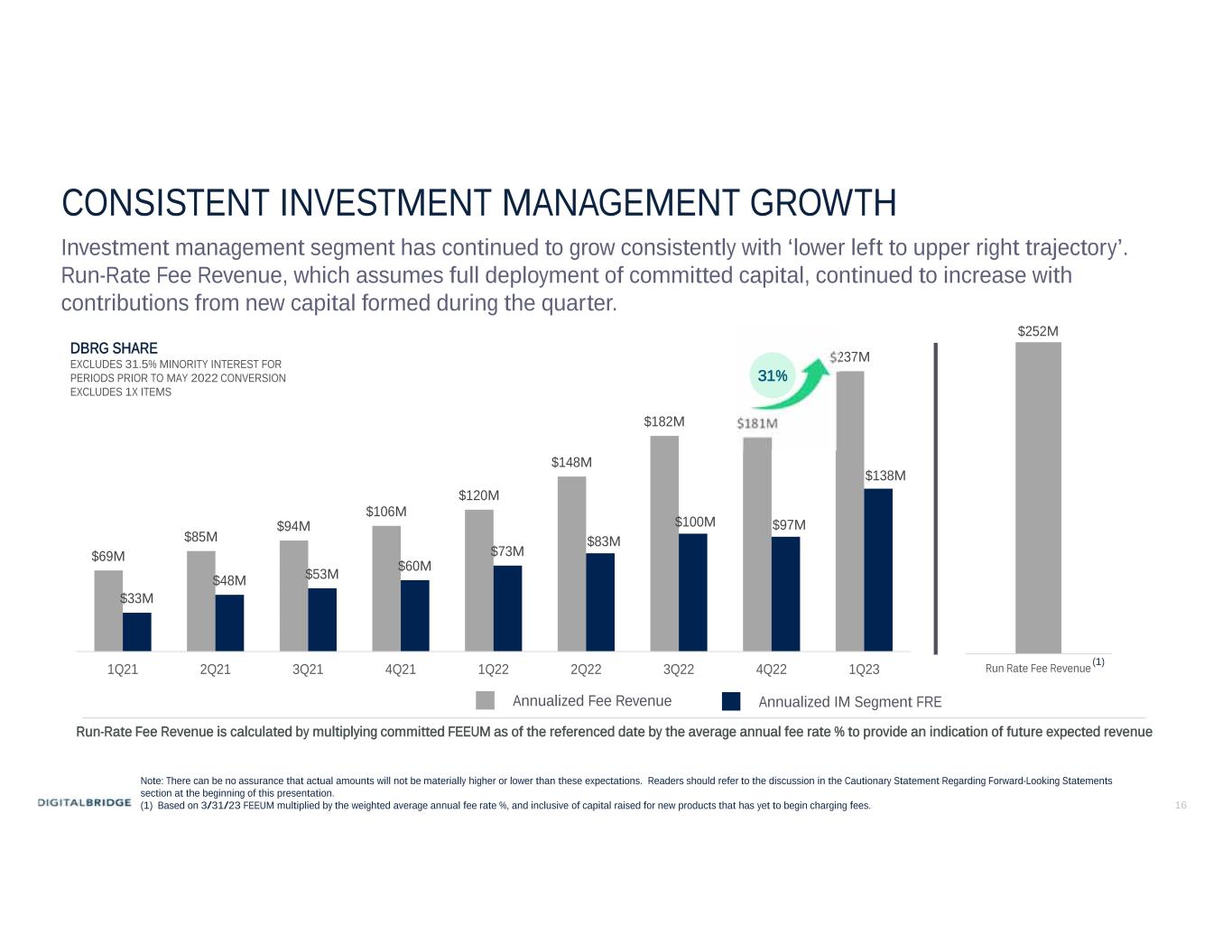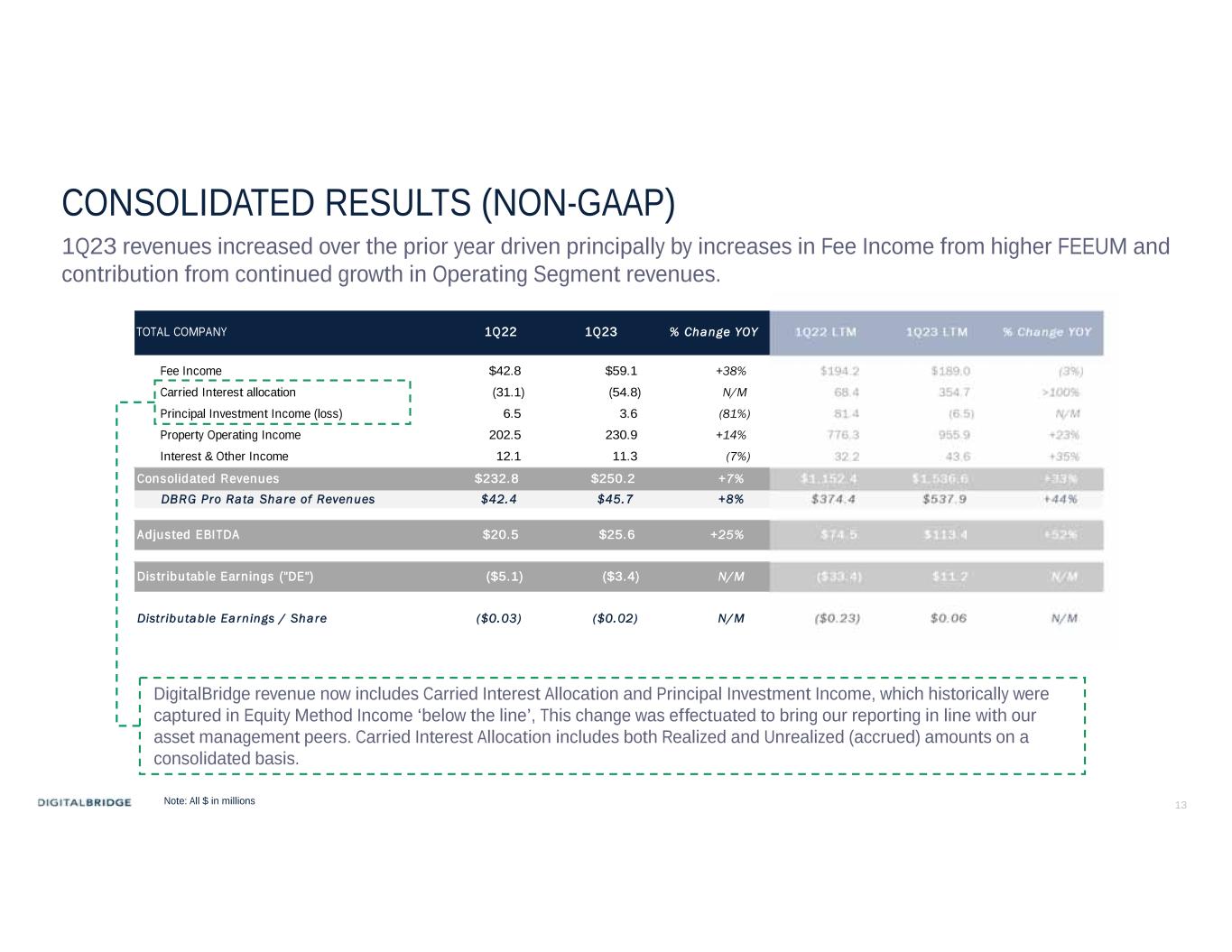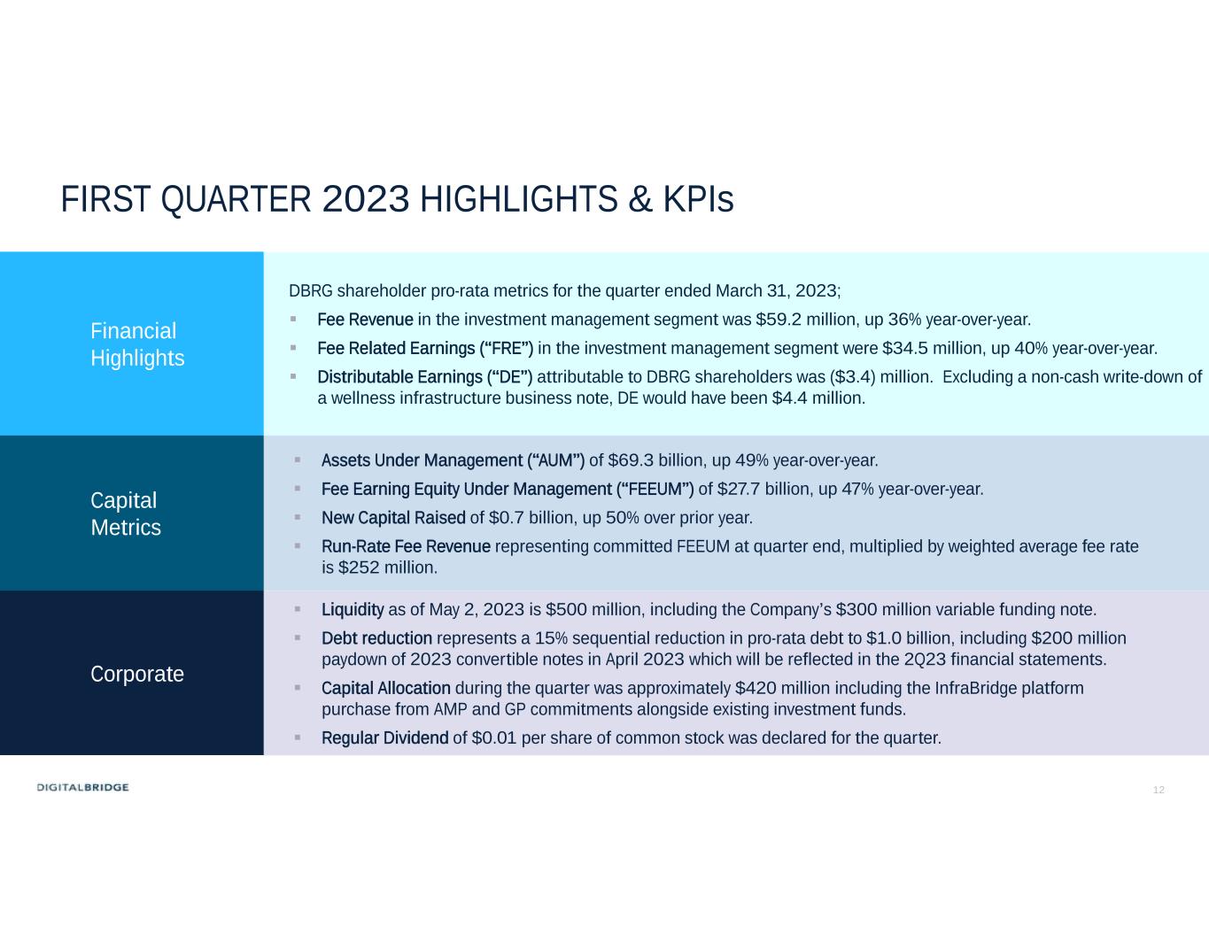 12 FIRST QUARTER 2023 HIGHLIGHTS & KPIs DBRG shareholder pro-rata metrics for the quarter ended March 31, 2023;  Fee Revenue in the investment management segment was $59.2 million, up 36% year-over-year.  Fee Related Earnings (“FRE”) in the investment management segment were $34.5 million, up 40% year-over-year.  Distributable Earnings (“DE”) attributable to DBRG shareholders was ($3.4) million. Excluding a non-cash write-down of a wellness infrastructure business note, DE would have been $4.4 million. Financial Highlights  Assets Under Management (“AUM”) of $69.3 billion, up 49% year-over-year.  Fee Earning Equity Under Management (“FEEUM”) of $27.7 billion, up 47% year-over-year.  New Capital Raised of $0.7 billion, up 50% over prior year.  Run-Rate Fee Revenue representing committed FEEUM at quarter end, multiplied by weighted average fee rate is $252 million. Capital Metrics  Liquidity as of May 2, 2023 is $500 million, including the Company’s $300 million variable funding note.  Debt reduction represents a 15% sequential reduction in pro-rata debt to $1.0 billion, including $200 million paydown of 2023 convertible notes in April 2023 which will be reflected in the 2Q23 financial statements.  Capital Allocation during the quarter was approximately $420 million including the InfraBridge platform purchase from AMP and GP commitments alongside existing investment funds.  Regular Dividend of $0.01 per share of common stock was declared for the quarter. Corporate