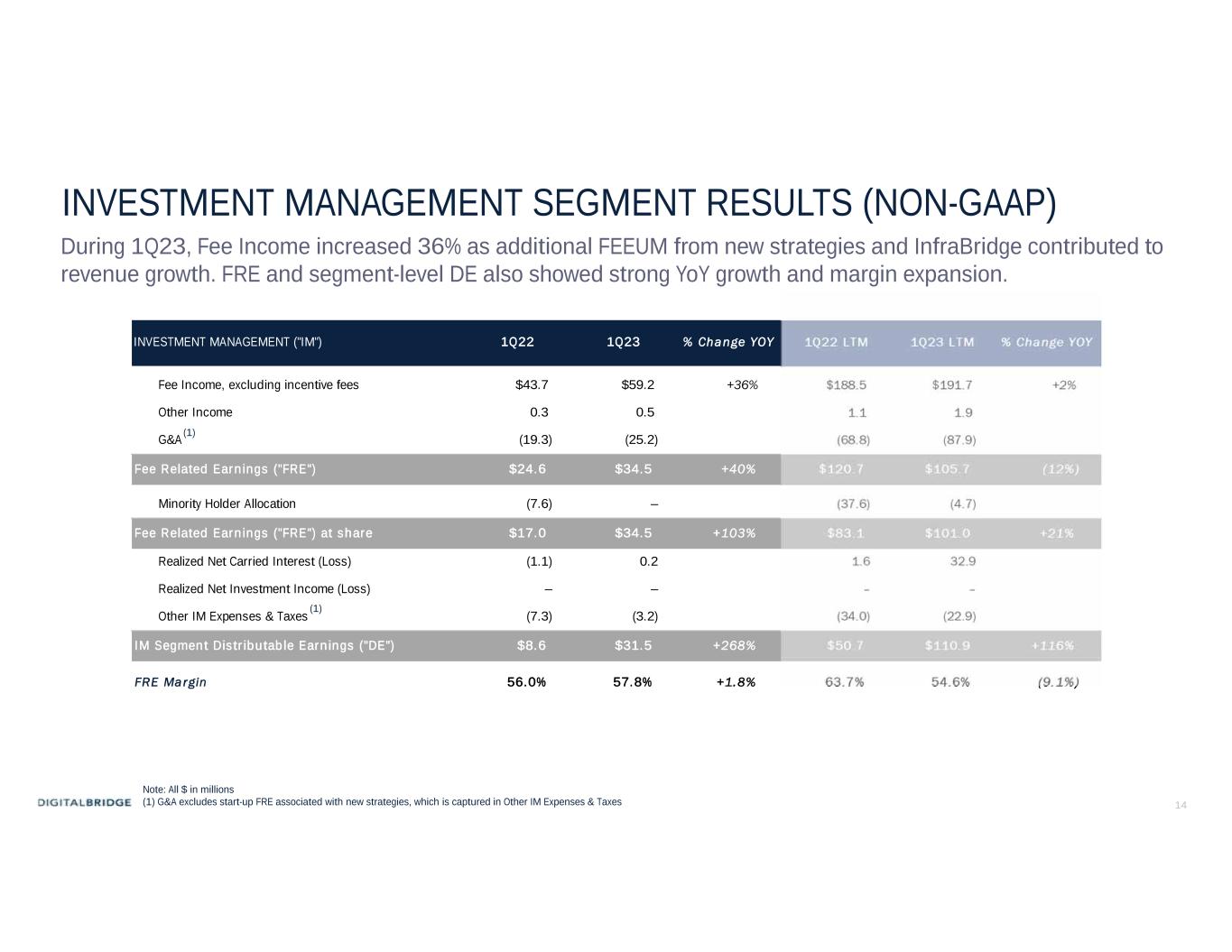13 TOTAL COMPANY 1Q22 1Q23 % Change YOY 1Q22 LTM 1Q23 LTM % Change YOY Fee Income $42.8 $59.1 +38% $194.2 $189.0 (3%) Carried Interest allocation (31.1) (54.8) N/M 68.4 354.7 >100% Principal Investment Income (loss) 6.5 3.6 (81%) 81.4 (6.5) N/M Property Operating Income 202.5 230.9 +14% 776.3 955.9 +23% Interest & Other Income 12.1 11.3 (7%) 32.2 43.6 +35% Consolidated Revenues $232.8 $250.2 +7% $1,152.4 $1,536.6 +33% DBRG Pro Rata Share of Revenues $42.4 $45.7 +8% $374.4 $537.9 +44% Adjusted EBITDA $20.5 $25.6 +25% $74.5 $113.4 +52% Distr ibutable Earnings ("DE") ($5.1) ($3.4) N/M ($33.4) $11.2 N/M Distr ibutable Earnings / Share ($0.03) ($0.02) N/M ($0.23) $0.06 N/M 1Q23 revenues increased over the prior year driven principally by increases in Fee Income from higher FEEUM and contribution from continued growth in Operating Segment revenues. CONSOLIDATED RESULTS (NON-GAAP) Note: All $ in millions DigitalBridge revenue now includes Carried Interest Allocation and Principal Investment Income, which historically were captured in Equity Method Income ‘below the line’, This change was effectuated to bring our reporting in line with our asset management peers. Carried Interest Allocation includes both Realized and Unrealized (accrued) amounts on a consolidated basis.