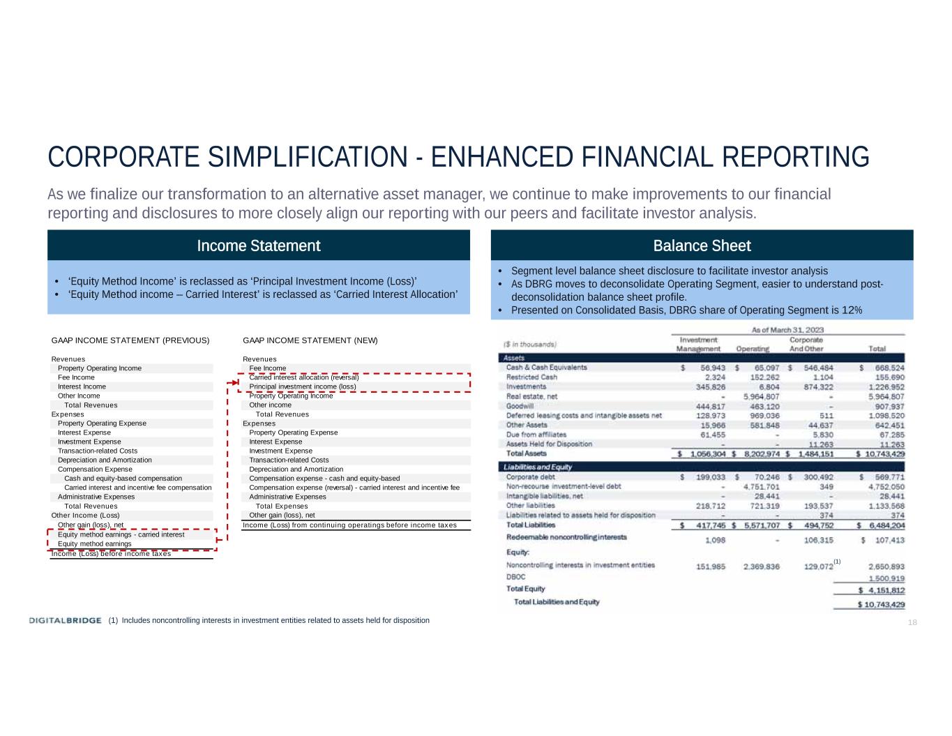 17 LIQUIDITY AND LEVERAGE YTD DBRG has executed key strategic capital allocation initiatives including, closing of the InfraBridge acquisition in February and finalizing the convertible note repayment in April. The note repayment further reduced company-wide leverage and DBRG remains on track to achieve its targeted corporate leverage levels by year-end. 12/31/22 Wafra Contingent Consideration Convertible Note Repayment BRSP Share Sale Current (1) 2023 Convertible senior note repaid on April 15, 2023 (2) Adjusted EBITDA used is 1Q23, adjusted for non-cash wellness note PIK interest, annualized. (3) Adjusted EBITDA used is the midpoint of 2023 Guidance. Note: There can be no assurance that actual amounts will not be materially higher or lower than these expectations. Readers should refer to the discussion in the Cautionary Statement Regarding Forward-Looking Statements section at the beginning of this presentation. InfraBridge Purchase LIQUIDITY LEVERAGE 12/31/22 Convertible Note Repayment $578M $569M Current Target Anticipated Deconsolidation Of Operating Anticipated Conversion Of ’25 Notes $300M Revolver Avail Other Net Activity $300M Revolver Avail 2.1x(3)7.5x(2)9.9x Operating Debt Increase(1) $378M $596M Total Debt / Adj. EBITDA