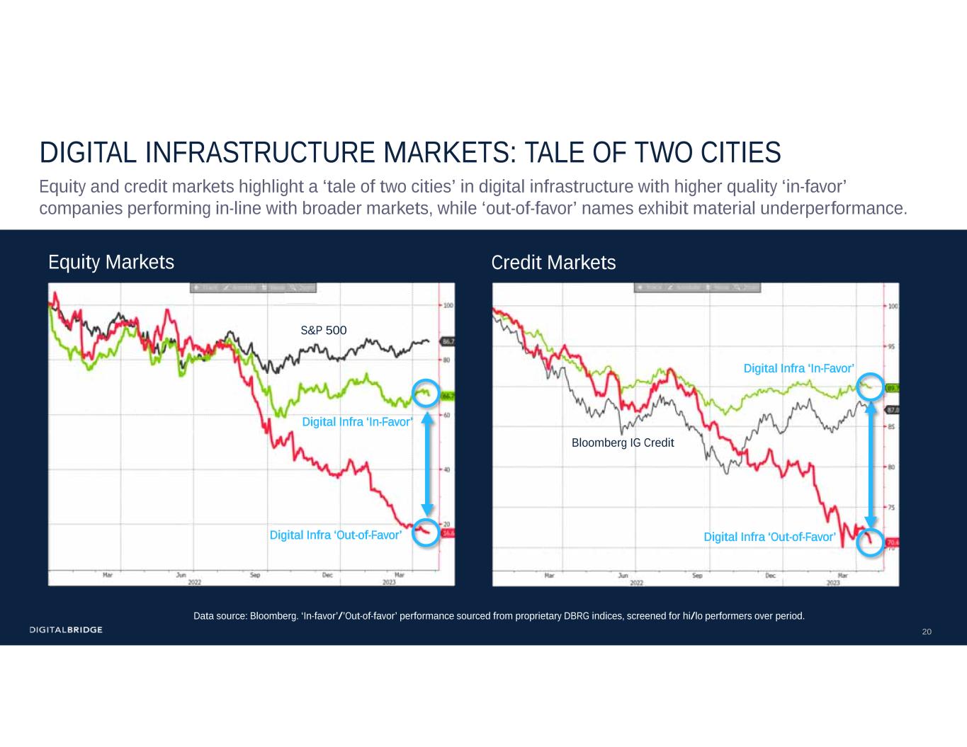 20 DIGITAL INFRASTRUCTURE MARKETS: TALE OF TWO CITIES Equity and credit markets highlight a ‘tale of two cities’ in digital infrastructure with higher quality ‘in-favor’ companies performing in-line with broader markets, while ‘out-of-favor’ names exhibit material underperformance. Credit MarketsEquity Markets Digital Infra ‘Out-of-Favor’ Digital Infra ‘In-Favor’ S&P 500 Digital Infra ‘Out-of-Favor’ Bloomberg IG Credit Digital Infra ‘In-Favor’ Data source: Bloomberg. ‘In-favor’/’Out-of-favor’ performance sourced from proprietary DBRG indices, screened for hi/lo performers over period.