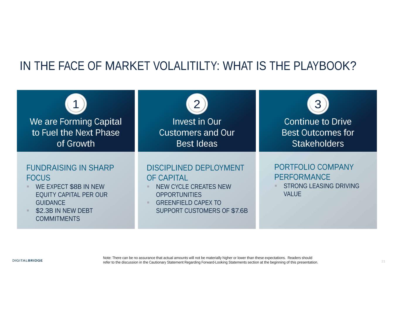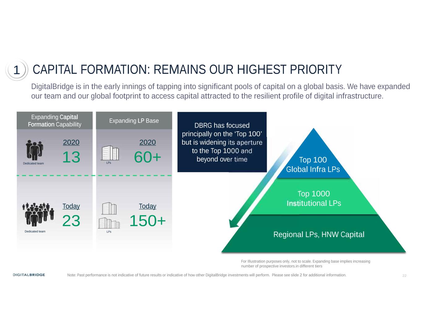 21 IN THE FACE OF MARKET VOLALITILTY: WHAT IS THE PLAYBOOK? We are Forming Capital to Fuel the Next Phase of Growth Invest in Our Customers and Our Best Ideas Continue to Drive Best Outcomes for Stakeholders 1 2 3 FUNDRAISING IN SHARP FOCUS  WE EXPECT $8B IN NEW EQUITY CAPITAL PER OUR GUIDANCE  $2.3B IN NEW DEBT COMMITMENTS DISCIPLINED DEPLOYMENT OF CAPITAL  NEW CYCLE CREATES NEW OPPORTUNITIES  GREENFIELD CAPEX TO SUPPORT CUSTOMERS OF $7.6B PORTFOLIO COMPANY PERFORMANCE  STRONG LEASING DRIVING VALUE Note: There can be no assurance that actual amounts will not be materially higher or lower than these expectations. Readers should refer to the discussion in the Cautionary Statement Regarding Forward-Looking Statements section at the beginning of this presentation.