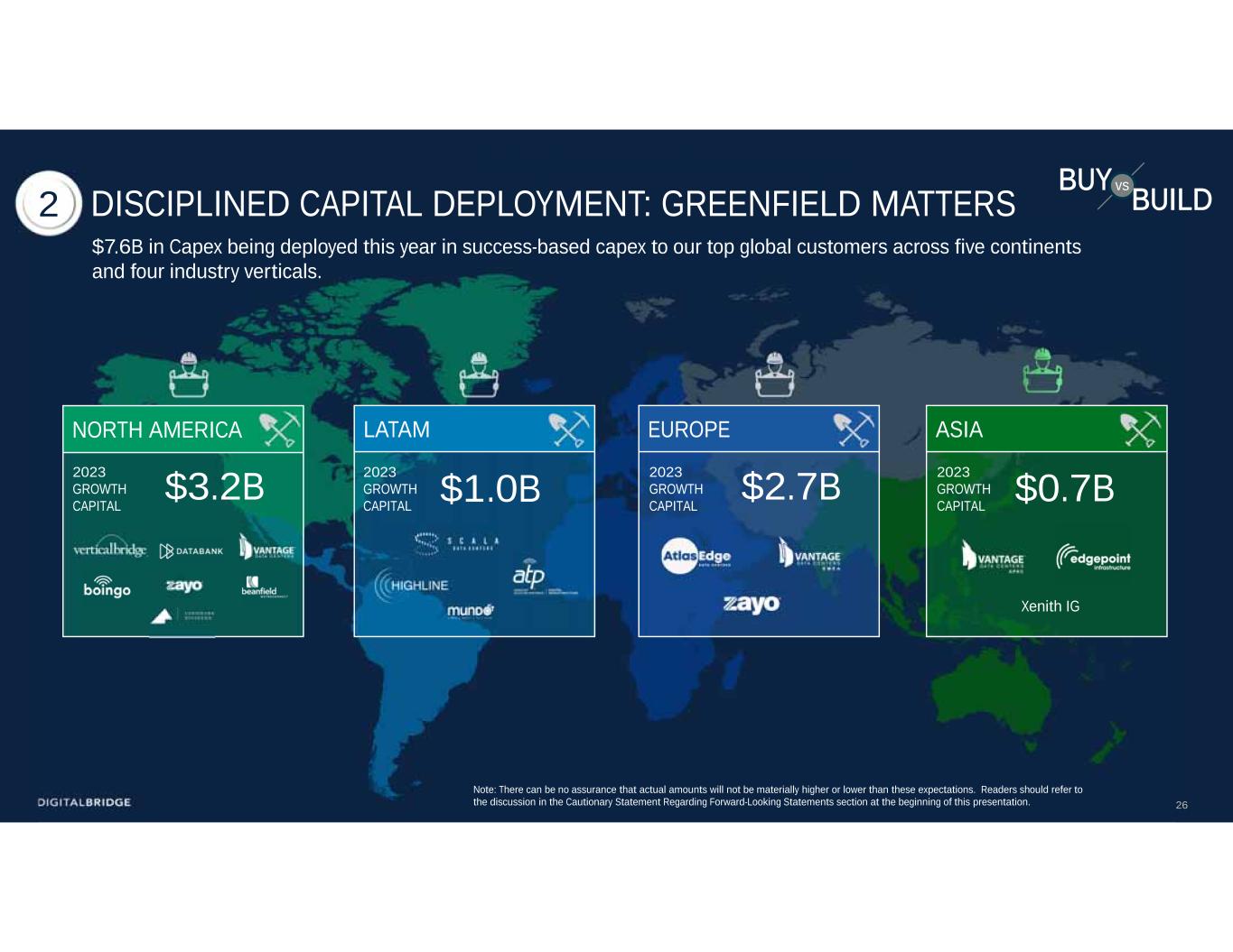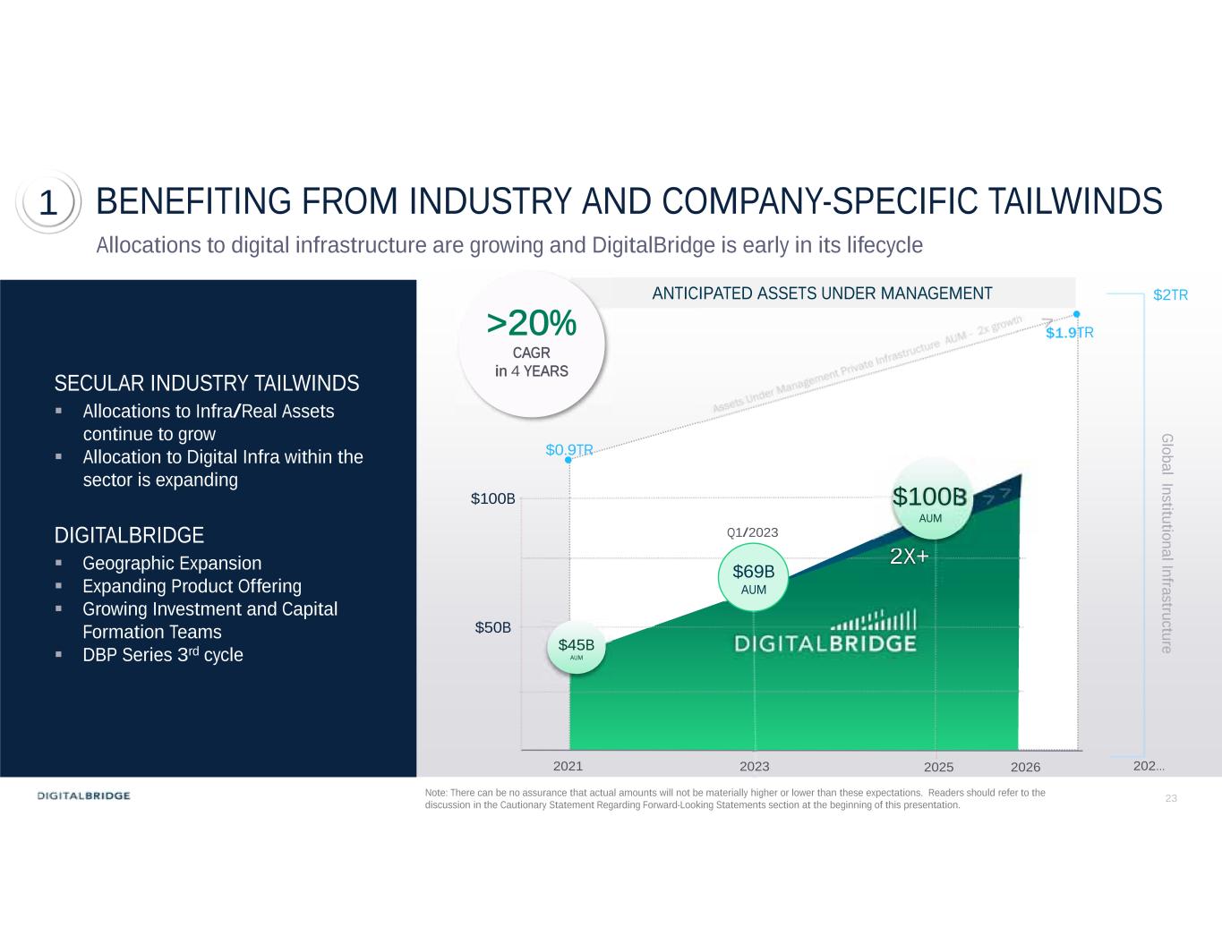 23Note: There can be no assurance that actual amounts will not be materially higher or lower than these expectations. Readers should refer to the discussion in the Cautionary Statement Regarding Forward-Looking Statements section at the beginning of this presentation. BENEFITING FROM INDUSTRY AND COMPANY-SPECIFIC TAILWINDS SECULAR INDUSTRY TAILWINDS  Allocations to Infra/Real Assets continue to grow  Allocation to Digital Infra within the sector is expanding DIGITALBRIDGE  Geographic Expansion  Expanding Product Offering  Growing Investment and Capital Formation Teams  DBP Series 3rd cycle 20262021 2025 $50B $1.9TR G lobal Institutional Infrastructure $0.9TR $100B $2TR 2X+ $100B AUM $45B AUM 202… ANTICIPATED ASSETS UNDER MANAGEMENT >20% CAGR in 4 YEARS 1 Allocations to digital infrastructure are growing and DigitalBridge is early in its lifecycle $69B AUM Q1/2023 2023