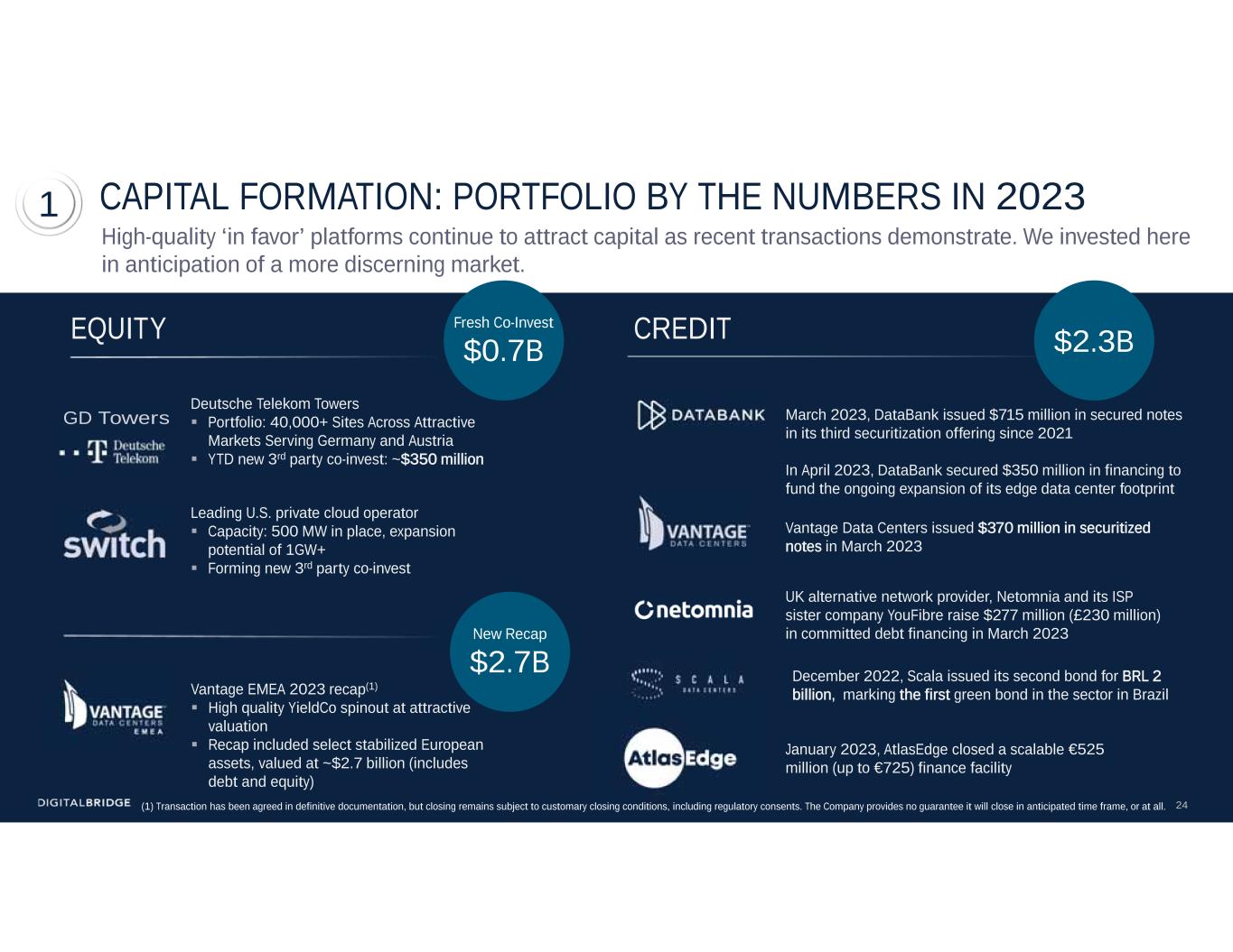 22 CAPITAL FORMATION: REMAINS OUR HIGHEST PRIORITY DigitalBridge is in the early innings of tapping into significant pools of capital on a global basis. We have expanded our team and our global footprint to access capital attracted to the resilient profile of digital infrastructure. Note: Past performance is not indicative of future results or indicative of how other DigitalBridge investments will perform. Please see slide 2 for additional information. Expanding Capital Formation Capability DBRG has focused principally on the ‘Top 100’ but is widening its aperture to the Top 1000 and beyond over time 23 Today 2020 13 Expanding LP Base 150+ Today 2020 60+ Top 1000 Institutional LPs Regional LPs, HNW Capital Dedicated team Dedicated team LPs LPs 1 Top 100 Global Infra LPs For Illustration purposes only, not to scale. Expanding base implies increasing number of prospective investors.in different tiers