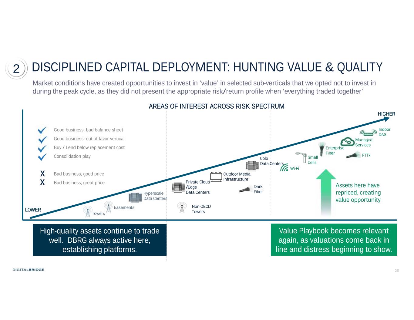 25 DISCIPLINED CAPITAL DEPLOYMENT: HUNTING VALUE & QUALITY Market conditions have created opportunities to invest in ‘value’ in selected sub-verticals that we opted not to invest in during the peak cycle, as they did not present the appropriate risk/return profile when ‘everything traded together’ Towers Hyperscale Data Centers Managed Services Enterprise Fiber Indoor DAS Outdoor Media Infrastructure Private Cloud /Edge Data Centers Small Cells Dark Fiber LOWER HIGHER Wi-Fi RETURN / RISK SPECTRUM Non-OECD Towers Easements FTTx RECENTLY REPRICEDValue Playbook becomes relevant again, as valuations come back in line and distress beginning to show. High-quality assets continue to trade well. DBRG always active here, establishing platforms. Assets here have repriced, creating value opportunity AREAS OF INTEREST ACROSS RISK SPECTRUM Good business, bad balance sheet Good business, out-of-favor vertical Buy / Lend below replacement cost Consolidation play Bad business, good price Bad business, great price x x 2 Colo Data Centers