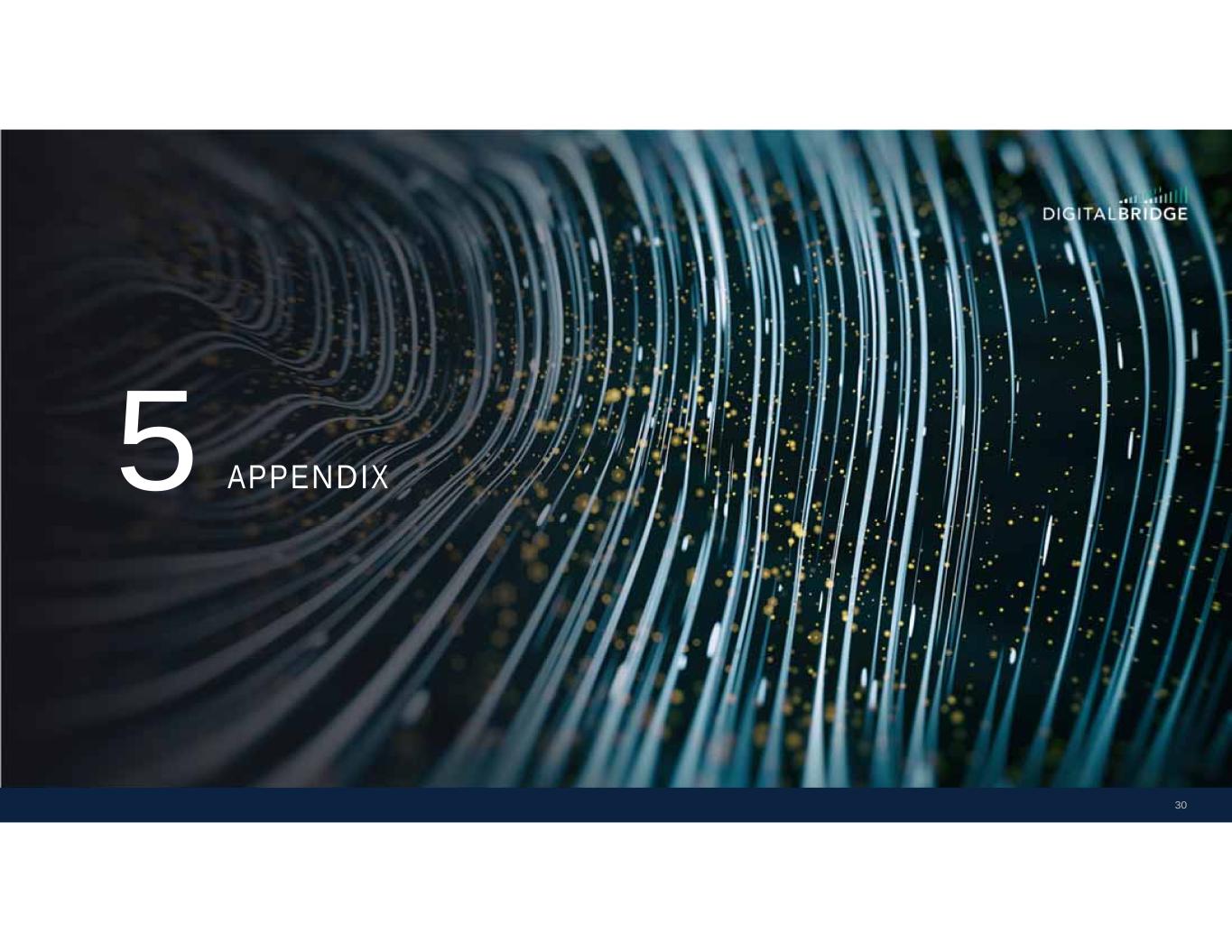 3 IMPORTANT NOTE REGARDING NON-GAAP FINANCIAL MEASURES This presentation includes certain “non-GAAP” supplemental measures that are not defined by generally accepted accounting principles, or GAAP, including the financial metrics defined below, of which the calculations may differ from methodologies utilized by other companies for similar performance measurements, and accordingly, may not be comparable to those of other companies. This presentation includes forward-looking guidance for certain non-GAAP financial measures, including Adjusted EBITDA, FRE, and Run-Rate Fee Revenue. These measures will differ from net income, determined in accordance with GAAP, in ways similar to those described in the reconciliations of historical Adjusted EBITDA and FRE to net income. We do not provide guidance for net income, determined in accordance with GAAP, or a reconciliation of guidance for these measures to the most directly comparable GAAP measure because the Company is not able to predict with reasonable certainty the amount or nature of all items that will be included in net income. Adjusted Earnings before Interest, Taxes, Depreciation and Amortization (Adjusted EBITDA): Adjusted EBITDA represents DE adjusted to exclude the following items attributable to the operating company: interest expense as included in DE, income tax expense or benefit as included in DE, preferred stock dividends, equity method earnings, placement fee expense, principal investment income or loss as included in DE, placement fee expense, our share of incentive fees and realized carried interest allocation or reversal net of associated compensation expense or reversal, certain investment costs for capital raising that are not reimbursable by our sponsored funds, and capital expenditures as deducted in DE. Adjusted EBITDA is presented on a reportable segment basis and for the Company in total. We believe that Adjusted EBITDA is a meaningful supplemental measure of performance because it presents the Company’s operating performance independent of its capital structure, leverage and non-cash items, which allows for better comparability against entities with different capital structures and income tax rates. However, because Adjusted EBITDA is calculated before recurring cash charges including interest expense and taxes and does not deduct capital expenditures or other recurring cash requirements, its usefulness as a performance measure may be limited. Assets Under Management (“AUM”): Assets owned by the Company’s balance sheet and assets for which the Company and its affiliates provide investment management services, including assets for which the Company may or may not charge management fees and/or performance allocations. Balance sheet AUM is based on the undepreciated carrying value of digital investments and the impaired carrying value of non digital investments as of the report date. Investment management AUM is based on the cost basis of managed investments as reported by each underlying vehicle as of the report date. AUM further includes uncalled capital commitments, but excludes DBRG OP’s share of non wholly-owned real estate investment management platform’s AUM. The Company's calculations of AUM may differ from the calculations of other asset managers, and as a result, this measure may not be comparable to similar measures presented by other asset managers. DigitalBridge Operating Company, LLC (“DBRG OP”): The operating partnership through which the Company conducts all of its activities and holds substantially all of its assets and liabilities. DBRG OP share excludes noncontrolling interests in investment entities. Fee Related Earnings (“FRE”): FRE is calculated as recurring fee income and other income inclusive of cost reimbursements (related to administrative expenses), and net of compensation expense (excluding equity-based compensation, carried interest and incentive compensation) and administrative expense (excluding placement fees and straight-line rent). FRE is used to assess the extent to which direct base compensation and operating expenses are covered by recurring fee revenues in the digital investment management business. We believe that FRE is a useful supplemental performance measure because it may provide additional insight into the profitability of the overall digital investment management business. FRE is measured as Adjusted EBITDA for the IM segment, adjusted to reflect the Company’s IM segment as a stabilized business by excluding FRE associated with new investment strategies that have 1) not yet held a first close raising FEEUM; or 2) not yet achieved break-even Adjusted EBITDA only for investment products that may be terminated solely at the Company’s discretion, collectively referred to as “Start-up FRE.” The Company evaluates new investment strategies on a regular basis and excludes Start-Up FRE from FRE until such time a new strategy is determined to form part of the Company’s core investment management business. Distributable Earnings (“DE”): DE is an after-tax measure that differs from GAAP net income or loss from continuing operations as a result of the following adjustments, including adjustment for our share of similar items recognized by our equity method investments: transaction-related costs; restructuring charges (primarily severance and retention costs); realized and unrealized gains and losses, except realized gains and losses from digital assets in Corporate and Other; depreciation, amortization and impairment charges; debt prepayment penalties, and amortization of deferred financing costs, debt premiums and debt discounts; our share of unrealized carried interest, net of associated compensation expense; equity-based compensation expense; equity method earnings from BRSP which is replaced with dividends declared by BRSP; effect of straight-line lease income and expense; impairment of equity investments directly attributable to decrease in valu