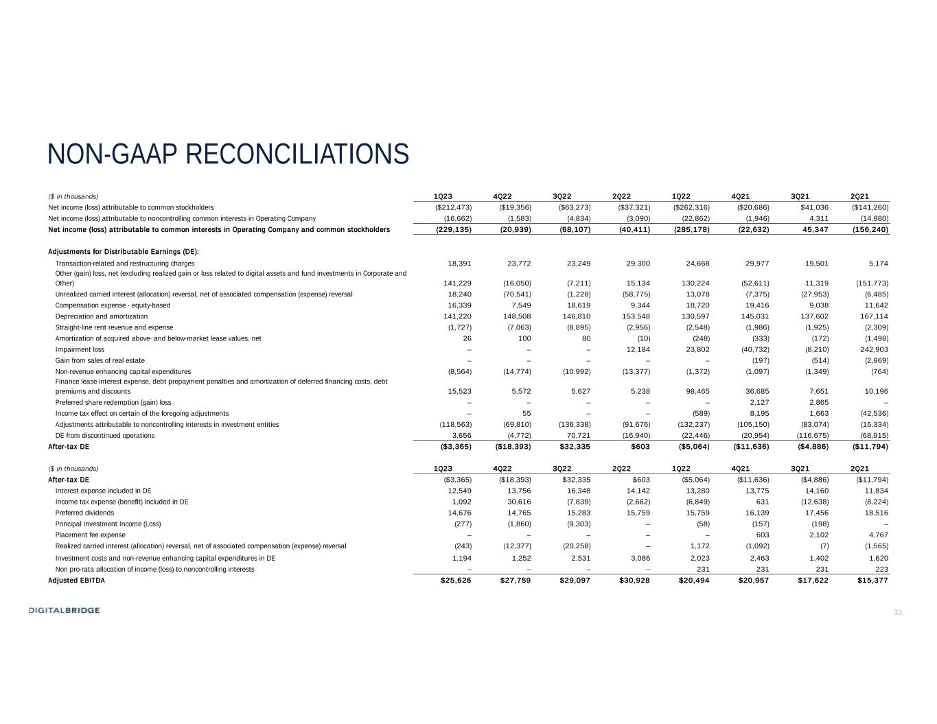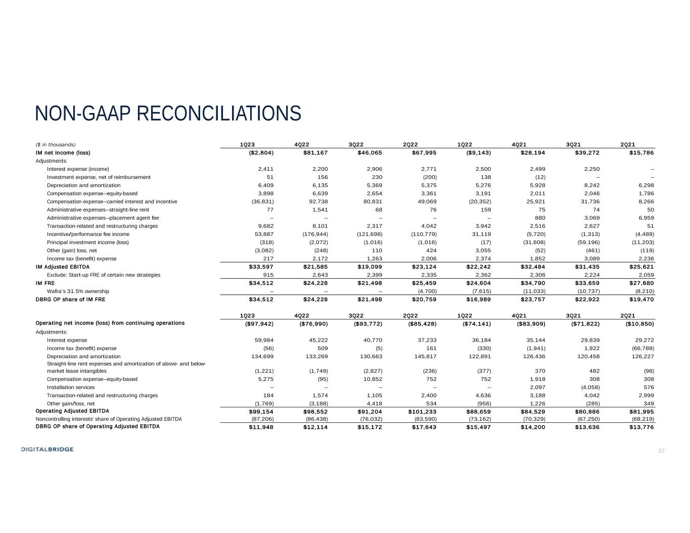 31 NON-GAAP RECONCILIATIONS ($ in thousands) 1Q23 4Q22 3Q22 2Q22 1Q22 4Q21 3Q21 2Q21 Net income (loss) attributable to common stockholders ($212,473) ($19,356) ($63,273) ($37,321) ($262,316) ($20,686) $41,036 ($141,260) Net income (loss) attributable to noncontrolling common interests in Operating Company (16,662) (1,583) (4,834) (3,090) (22,862) (1,946) 4,311 (14,980) Net income (loss) attributable to common interests in Operating Company and common stockholders (229,135) (20,939) (68,107) (40,411) (285,178) (22,632) 45,347 (156,240) Adjustments for Distributable Earnings (DE): Transaction-related and restructuring charges 18,391 23,772 23,249 29,300 24,668 29,977 19,501 5,174 Other (gain) loss, net (excluding realized gain or loss related to digital assets and fund investments in Corporate and Other) 141,229 (16,050) (7,211) 15,134 130,224 (52,611) 11,319 (151,773) Unrealized carried interest (allocation) reversal, net of associated compensation (expense) reversal 18,240 (70,541) (1,228) (58,775) 13,078 (7,375) (27,953) (6,485) Compensation expense - equity-based 16,339 7,549 18,619 9,344 18,720 19,416 9,038 11,642 Depreciation and amortization 141,220 148,508 146,810 153,548 130,597 145,031 137,602 167,114 Straight-line rent revenue and expense (1,727) (7,063) (8,895) (2,956) (2,548) (1,986) (1,925) (2,309) Amortization of acquired above- and below-market lease values, net 26 100 80 (10) (248) (333) (172) (1,498) Impairment loss – – – 12,184 23,802 (40,732) (8,210) 242,903 Gain from sales of real estate – – – – – (197) (514) (2,969) Non-revenue enhancing capital expenditures (8,564) (14,774) (10,992) (13,377) (1,372) (1,097) (1,349) (764) Finance lease interest expense, debt prepayment penalties and amortization of deferred financing costs, debt premiums and discounts 15,523 5,572 5,627 5,238 98,465 36,685 7,651 10,196 Preferred share redemption (gain) loss – – – – – 2,127 2,865 – Income tax effect on certain of the foregoing adjustments – 55 – – (589) 8,195 1,663 (42,536) Adjustments attributable to noncontrolling interests in investment entities (118,563) (69,810) (136,338) (91,676) (132,237) (105,150) (83,074) (15,334) DE from discontinued operations 3,656 (4,772) 70,721 (16,940) (22,446) (20,954) (116,675) (68,915) After-tax DE ($3,365) ($18,393) $32,335 $603 ($5,064) ($11,636) ($4,886) ($11,794) ($ in thousands) 1Q23 4Q22 3Q22 2Q22 1Q22 4Q21 3Q21 2Q21 After-tax DE ($3,365) ($18,393) $32,335 $603 ($5,064) ($11,636) ($4,886) ($11,794) Interest expense included in DE 12,549 13,756 16,348 14,142 13,280 13,775 14,160 11,834 Income tax expense (benefit) included in DE 1,092 30,616 (7,839) (2,662) (6,849) 631 (12,638) (8,224) Preferred dividends 14,676 14,765 15,283 15,759 15,759 16,139 17,456 18,516 Principal Investment Income (Loss) (277) (1,860) (9,303) – (58) (157) (198) – Placement fee expense – – – – – 603 2,102 4,767 Realized carried interest (allocation) reversal, net of associated compensation (expense) reversal (243) (12,377) (20,258) – 1,172 (1,092) (7) (1,565) Investment costs and non-revenue enhancing capital expenditures in DE 1,194 1,252 2,531 3,086 2,023 2,463 1,402 1,620 Non pro-rata allocation of income (loss) to noncontrolling interests – – – – 231 231 231 223 Adjusted EBITDA $25,626 $27,759 $29,097 $30,928 $20,494 $20,957 $17,622 $15,377