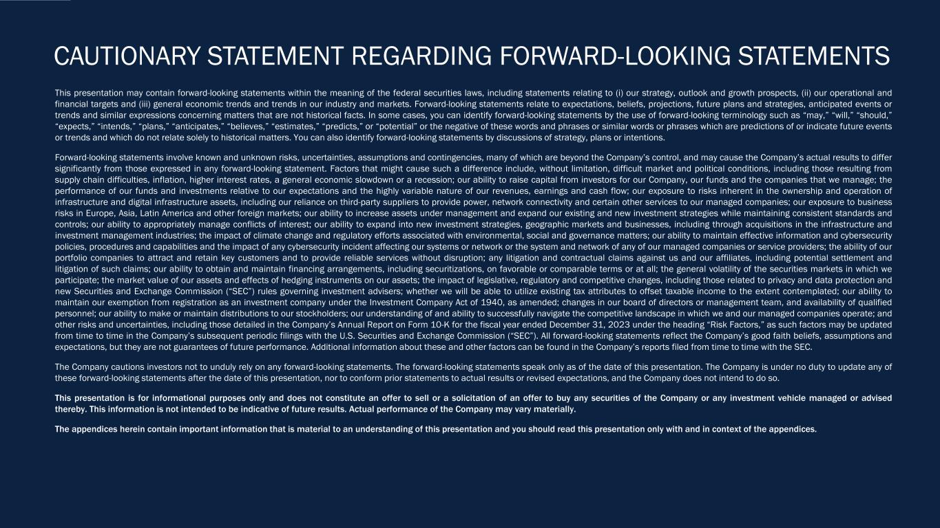 2 CAUTIONARY STATEMENT REGARDING FORWARD-LOOKING STATEMENTS This presentation may contain forward-looking statements within the meaning of the federal securities laws, including statements relating to (i) our strategy, outlook and growth prospects, (ii) our operational and financial targets and (iii) general economic trends and trends in our industry and markets. Forward-looking statements relate to expectations, beliefs, projections, future plans and strategies, anticipated events or trends and similar expressions concerning matters that are not historical facts. In some cases, you can identify forward-looking statements by the use of forward-looking terminology such as “may,” “will,” “should,” “expects,” “intends,” “plans,” “anticipates,” “believes,” “estimates,” “predicts,” or “potential” or the negative of these words and phrases or similar words or phrases which are predictions of or indicate future events or trends and which do not relate solely to historical matters. You can also identify forward-looking statements by discussions of strategy, plans or intentions. Forward-looking statements involve known and unknown risks, uncertainties, assumptions and contingencies, many of which are beyond the Company’s control, and may cause the Company’s actual results to differ significantly from those expressed in any forward-looking statement. Factors that might cause such a difference include, without limitation, difficult market and political conditions, including those resulting from supply chain difficulties, inflation, higher interest rates, a general economic slowdown or a recession; our ability to raise capital from investors for our Company, our funds and the companies that we manage; the performance of our funds and investments relative to our expectations and the highly variable nature of our revenues, earnings and cash flow; our exposure to risks inherent in the ownership and operation of infrastructure and digital infrastructure assets, including our reliance on third-party suppliers to provide power, network connectivity and certain other services to our managed companies; our exposure to business risks in Europe, Asia, Latin America and other foreign markets; our ability to increase assets under management and expand our existing and new investment strategies while maintaining consistent standards and controls; our ability to appropriately manage conflicts of interest; our ability to expand into new investment strategies, geographic markets and businesses, including through acquisitions in the infrastructure and investment management industries; the impact of climate change and regulatory efforts associated with environmental, social and governance matters; our ability to maintain effective information and cybersecurity policies, procedures and capabilities and the impact of any cybersecurity incident affecting our systems or network or the system and network of any of our managed companies or service providers; the ability of our portfolio companies to attract and retain key customers and to provide reliable services without disruption; any litigation and contractual claims against us and our affiliates, including potential settlement and litigation of such claims; our ability to obtain and maintain financing arrangements, including securitizations, on favorable or comparable terms or at all; the general volatility of the securities markets in which we participate; the market value of our assets and effects of hedging instruments on our assets; the impact of legislative, regulatory and competitive changes, including those related to privacy and data protection and new Securities and Exchange Commission (“SEC”) rules governing investment advisers; whether we will be able to utilize existing tax attributes to offset taxable income to the extent contemplated; our ability to maintain our exemption from registration as an investment company under the Investment Company Act of 1940, as amended; changes in our board of directors or management team, and availability of qualified personnel; our ability to make or maintain distributions to our stockholders; our understanding of and ability to successfully navigate the competitive landscape in which we and our managed companies operate; and other risks and uncertainties, including those detailed in the Company’s Annual Report on Form 10-K for the fiscal year ended December 31, 2023 under the heading “Risk Factors,” as such factors may be updated from time to time in the Company’s subsequent periodic filings with the U.S. Securities and Exchange Commission (“SEC”). All forward-looking statements reflect the Company’s good faith beliefs, assumptions and expectations, but they are not guarantees of future performance. Additional information about these and other factors can be found in the Company’s reports filed from time to time with the SEC. The Company cautions investors not to unduly rely on any forward-looking statements. The forward-looking statements speak only as of the date of this presentation. The Company is under no duty to update any of these forward-looking statements after the date of this presentation, nor to conform prior statements to actual results or revised expectations, and the Company does not intend to do so. This presentation is for informational purposes only and does not constitute an offer to sell or a solicitation of an offer to buy any securities of the Company or any investment vehicle managed or advised thereby. This information is not intended to be indicative of future results. Actual performance of the Company may vary materially. The appendices herein contain important information that is material to an understanding of this presentation and you should read this presentation only with and in context of the appendices.
