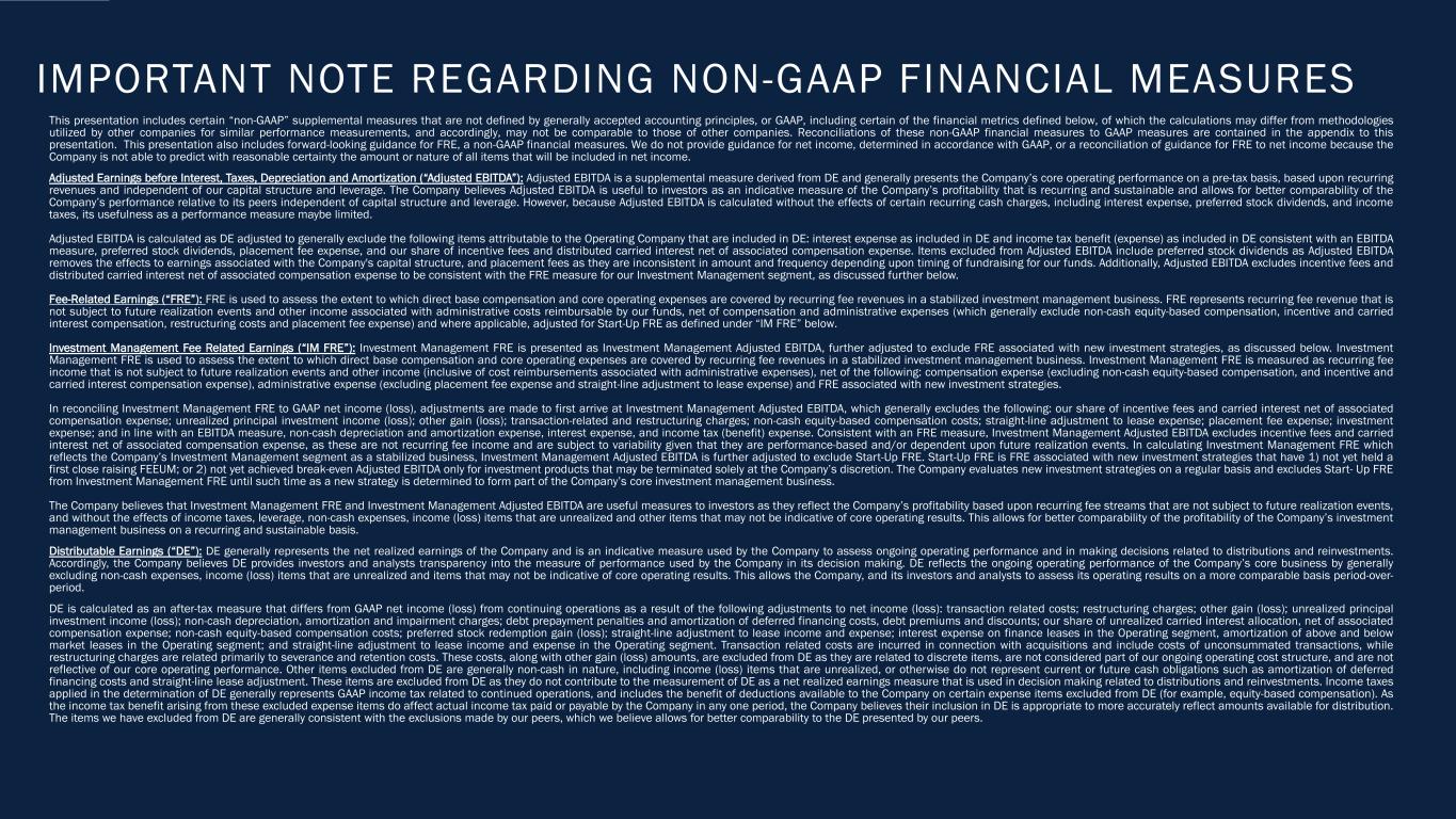 3 IMPORTANT NOTE REGARDING NON-GAAP FINANCIAL MEASURES This presentation includes certain “non-GAAP” supplemental measures that are not defined by generally accepted accounting principles, or GAAP, including certain of the financial metrics defined below, of which the calculations may differ from methodologies utilized by other companies for similar performance measurements, and accordingly, may not be comparable to those of other companies. Reconciliations of these non-GAAP financial measures to GAAP measures are contained in the appendix to this presentation. This presentation also includes forward-looking guidance for FRE, a non-GAAP financial measures. We do not provide guidance for net income, determined in accordance with GAAP, or a reconciliation of guidance for FRE to net income because the Company is not able to predict with reasonable certainty the amount or nature of all items that will be included in net income. Adjusted Earnings before Interest, Taxes, Depreciation and Amortization (“Adjusted EBITDA”): Adjusted EBITDA is a supplemental measure derived from DE and generally presents the Company’s core operating performance on a pre-tax basis, based upon recurring revenues and independent of our capital structure and leverage. The Company believes Adjusted EBITDA is useful to investors as an indicative measure of the Company’s profitability that is recurring and sustainable and allows for better comparability of the Company’s performance relative to its peers independent of capital structure and leverage. However, because Adjusted EBITDA is calculated without the effects of certain recurring cash charges, including interest expense, preferred stock dividends, and income taxes, its usefulness as a performance measure maybe limited. Adjusted EBITDA is calculated as DE adjusted to generally exclude the following items attributable to the Operating Company that are included in DE: interest expense as included in DE and income tax benefit (expense) as included in DE consistent with an EBITDA measure, preferred stock dividends, placement fee expense, and our share of incentive fees and distributed carried interest net of associated compensation expense. Items excluded from Adjusted EBITDA include preferred stock dividends as Adjusted EBITDA removes the effects to earnings associated with the Company's capital structure, and placement fees as they are inconsistent in amount and frequency depending upon timing of fundraising for our funds. Additionally, Adjusted EBITDA excludes incentive fees and distributed carried interest net of associated compensation expense to be consistent with the FRE measure for our Investment Management segment, as discussed further below. Fee-Related Earnings (“FRE”): FRE is used to assess the extent to which direct base compensation and core operating expenses are covered by recurring fee revenues in a stabilized investment management business. FRE represents recurring fee revenue that is not subject to future realization events and other income associated with administrative costs reimbursable by our funds, net of compensation and administrative expenses (which generally exclude non-cash equity-based compensation, incentive and carried interest compensation, restructuring costs and placement fee expense) and where applicable, adjusted for Start-Up FRE as defined under “IM FRE” below. Investment Management Fee Related Earnings (“IM FRE”): Investment Management FRE is presented as Investment Management Adjusted EBITDA, further adjusted to exclude FRE associated with new investment strategies, as discussed below. Investment Management FRE is used to assess the extent to which direct base compensation and core operating expenses are covered by recurring fee revenues in a stabilized investment management business. Investment Management FRE is measured as recurring fee income that is not subject to future realization events and other income (inclusive of cost reimbursements associated with administrative expenses), net of the following: compensation expense (excluding non-cash equity-based compensation, and incentive and carried interest compensation expense), administrative expense (excluding placement fee expense and straight-line adjustment to lease expense) and FRE associated with new investment strategies. In reconciling Investment Management FRE to GAAP net income (loss), adjustments are made to first arrive at Investment Management Adjusted EBITDA, which generally excludes the following: our share of incentive fees and carried interest net of associated compensation expense; unrealized principal investment income (loss); other gain (loss); transaction-related and restructuring charges; non-cash equity-based compensation costs; straight-line adjustment to lease expense; placement fee expense; investment expense; and in line with an EBITDA measure, non-cash depreciation and amortization expense, interest expense, and income tax (benefit) expense. Consistent with an FRE measure, Investment Management Adjusted EBITDA excludes incentive fees and carried interest net of associated compensation expense, as these are not recurring fee income and are subject to variability given that they are performance-based and/or dependent upon future realization events. In calculating Investment Management FRE which reflects the Company’s Investment Management segment as a stabilized business, Investment Management Adjusted EBITDA is further adjusted to exclude Start-Up FRE. Start-Up FRE is FRE associated with new investment strategies that have 1) not yet held a first close raising FEEUM; or 2) not yet achieved break-even Adjusted EBITDA only for investment products that may be terminated solely at the Company’s discretion. The Company evaluates new investment strategies on a regular basis and excludes Start- Up FRE from Investment Management FRE until such time as a new strategy is determined to form part of the Company’s core investment man