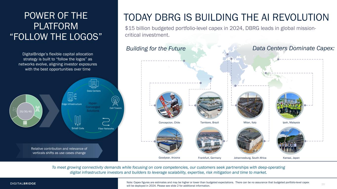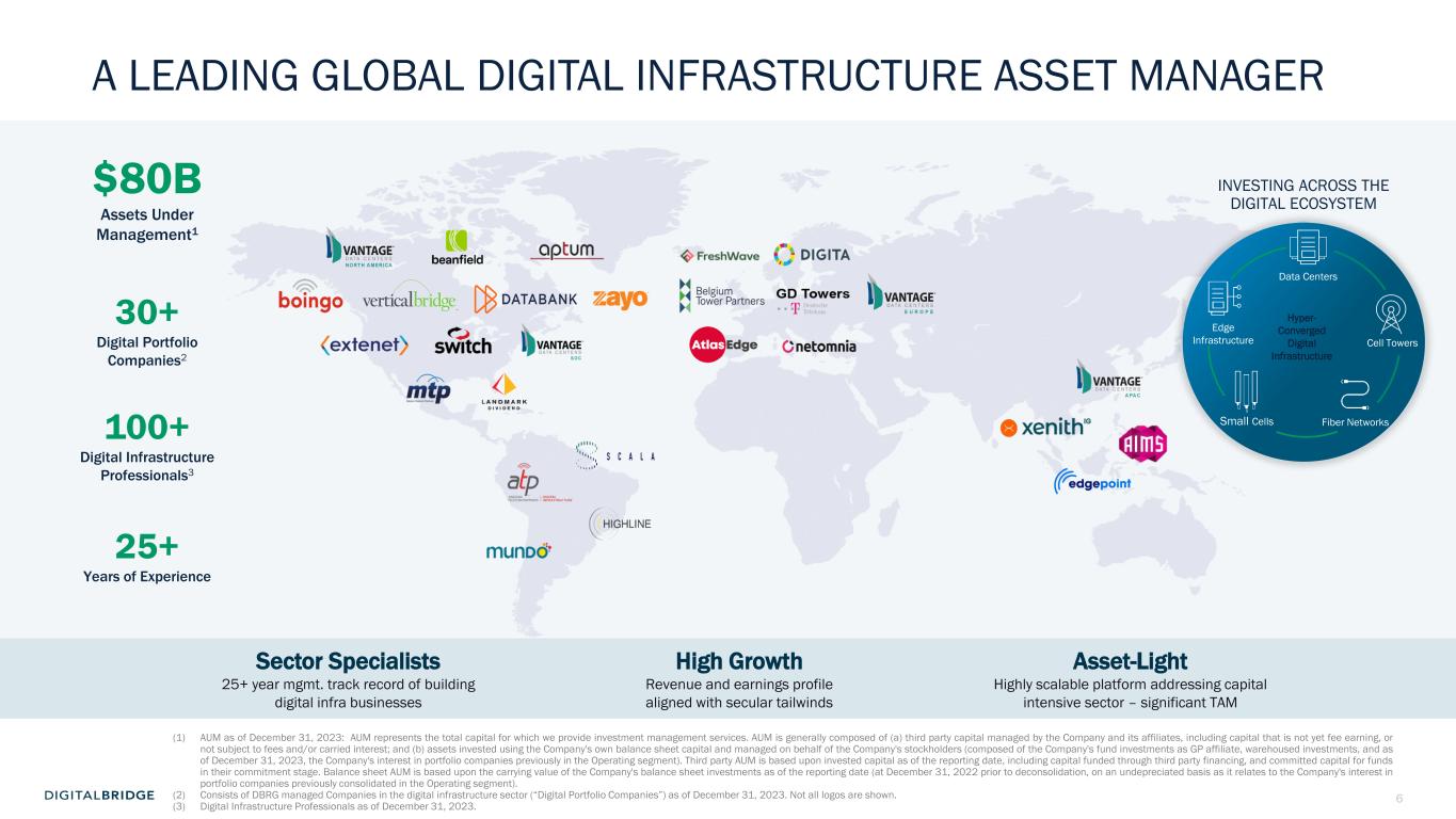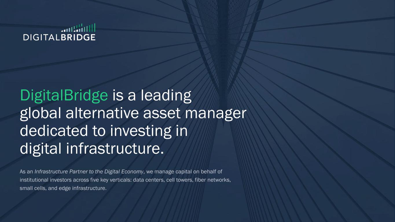 5 DigitalBridge is a leading global alternative asset manager dedicated to investing in digital infrastructure. As an Infrastructure Partner to the Digital Economy, we manage capital on behalf of institutional investors across five key verticals: data centers, cell towers, fiber networks, small cells, and edge infrastructure.