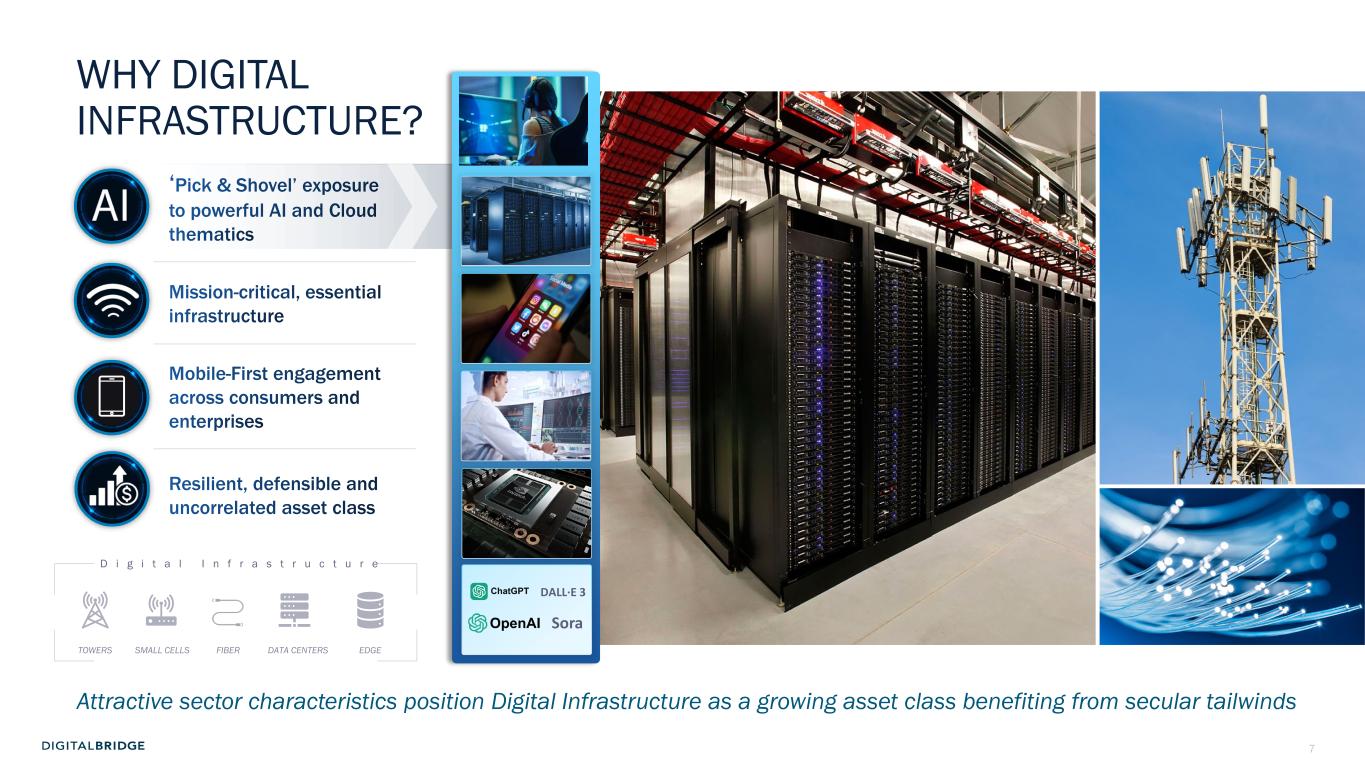 6 $80B Assets Under Management1 30+ Digital Portfolio Companies2 100+ Digital Infrastructure Professionals3 25+ Years of Experience A LEADING GLOBAL DIGITAL INFRASTRUCTURE ASSET MANAGER (1) AUM as of December 31, 2023: AUM represents the total capital for which we provide investment management services. AUM is generally composed of (a) third party capital managed by the Company and its affiliates, including capital that is not yet fee earning, or not subject to fees and/or carried interest; and (b) assets invested using the Company's own balance sheet capital and managed on behalf of the Company's stockholders (composed of the Company's fund investments as GP affiliate, warehoused investments, and as of December 31, 2023, the Company's interest in portfolio companies previously in the Operating segment). Third party AUM is based upon invested capital as of the reporting date, including capital funded through third party financing, and committed capital for funds in their commitment stage. Balance sheet AUM is based upon the carrying value of the Company's balance sheet investments as of the reporting date (at December 31, 2022 prior to deconsolidation, on an undepreciated basis as it relates to the Company's interest in portfolio companies previously consolidated in the Operating segment). (2) Consists of DBRG managed Companies in the digital infrastructure sector (“Digital Portfolio Companies”) as of December 31, 2023. Not all logos are shown. (3) Digital Infrastructure Professionals as of December 31, 2023. INVESTING ACROSS THE DIGITAL ECOSYSTEM Sector Specialists 25+ year mgmt. track record of building digital infra businesses High Growth Revenue and earnings profile aligned with secular tailwinds Asset-Light Highly scalable platform addressing capital intensive sector – significant TAM Cell Towers Small Cells Fiber Networks Data Centers Edge Infrastructure Hyper- Converged Digital Infrastructure