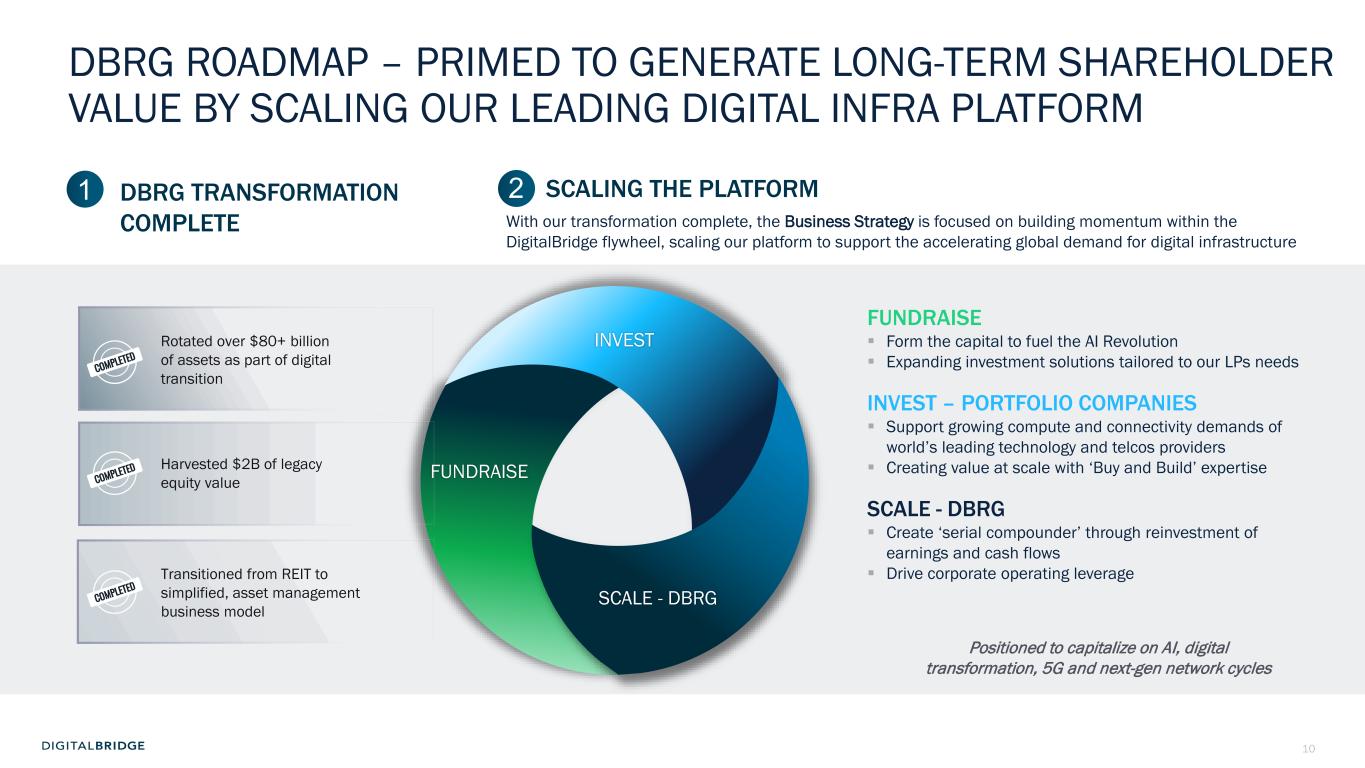 9 Business Building / Growth PhaseMature, Stabilized, Yield-Focused DIGITAL INFRASTRUCTURE EQUITY ‘Value-Add’ Digital Infrastructure Equity Investing on a Global Basis CORE PLUS Long-Duration, Stabilized Assets VENTURES Software Powering Next-Gen Networks LIQUID Public Market Investing Built to Capitalize on Opportunities Across The Sector CREDIT Financing the Digital Economy Positioned to deliver long-duration investment solutions across digital asset classes with a scalable, asset-light business model Our PlatformAn Alternative Asset Manager Focused on Digital DigitalBridge is a leading alternative asset manager levered to the powerful tailwinds driving global investment in digital infrastructure. As a Partner of Choice to large institutional investors, DigitalBridge leverages our deep domain expertise to deliver long-duration investment solutions that create value across the digital ecosystem. Public Listing: NYSE - DBRG FEEUM: $33 Billion(1) Business Model Investment management fees and profits participation (carried interest) Financial Profile Growing, high-visibility earnings stream backed by investment-grade clients Founded: 1991 AUM: $80 Billion(1) Digital Infrastructure Specialists 25+ year mgmt. track record of building value in digital infra At-a-Glance Note: All figures as of December 31, 2023, unless otherwise specified (1) Includes digital and non-digital DBRG managed companies. A LEADING GLOBAL DIGITAL INFRASTRUCTURE ASSET MANAGER