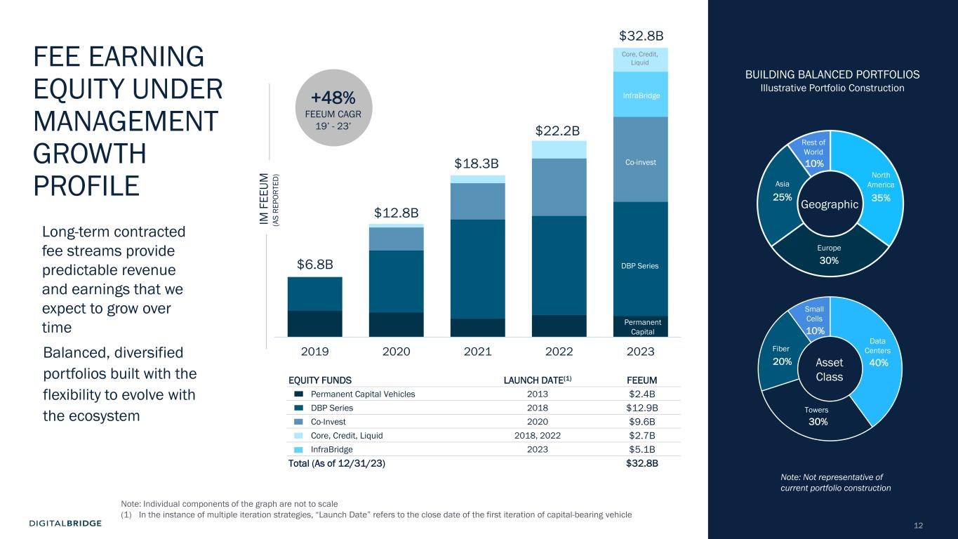 11 AN ALTERNATIVE WAY TO INVEST IN DIGITAL INFRASTRUCTURE Leading management team with operating DNA driving strong revenue and earnings growth EXPECTED FINANCIAL IMPACT: Powerful absolute and relative growth with revenue targeted to grow >25% and cash flow metrics expected to increase >90% in 2024 Highly-scalable alternative asset management business model capitalizes on DBRG position as Partner of Choice to institutional investors EXPECTED FINANCIAL IMPACT: Platform with lower capital intensity has structurally higher and improving ROIC profile ASSET-LIGHT POSITIONED FOR HIGH-GROWTH ECOSYSTEM INVESTING Full Stack digital infrastructure investor built to capitalize on $400B+ annual global capex now being accelerated by AI EXPECTED FINANCIAL IMPACT: Access to business-building/ development economics creates more durable, diversified return profile that generates fees/carry through cycles AN ALTERNATIVE WAY TO INVEST IN DIGITAL INFRASTRUCTURE ALTERNATIVE INVESTMENT FRAMEWORK TRADITIONAL DIGITAL INFRASTRUCTURE INVESTING TRADITIONAL DIGITAL INFRASTRUCTURE INVESTING Capital-intensive ownership of digital infrastructure, a resilient asset class, benefiting from: • AI-Led Powerful Secular Tailwinds • Predictable Long-Term Contracted Cash Flows • Investment Grade Counterparties Note: There can be no assurance that actual amounts will not be materially higher or lower than these targets. Readers should refer to the discussion in the Cautionary Statement Regarding Forward-Looking Statements section at the beginning of this presentation. Additionally, the Company undertakes no obligation to provide updated projections on a quarterly or other basis.