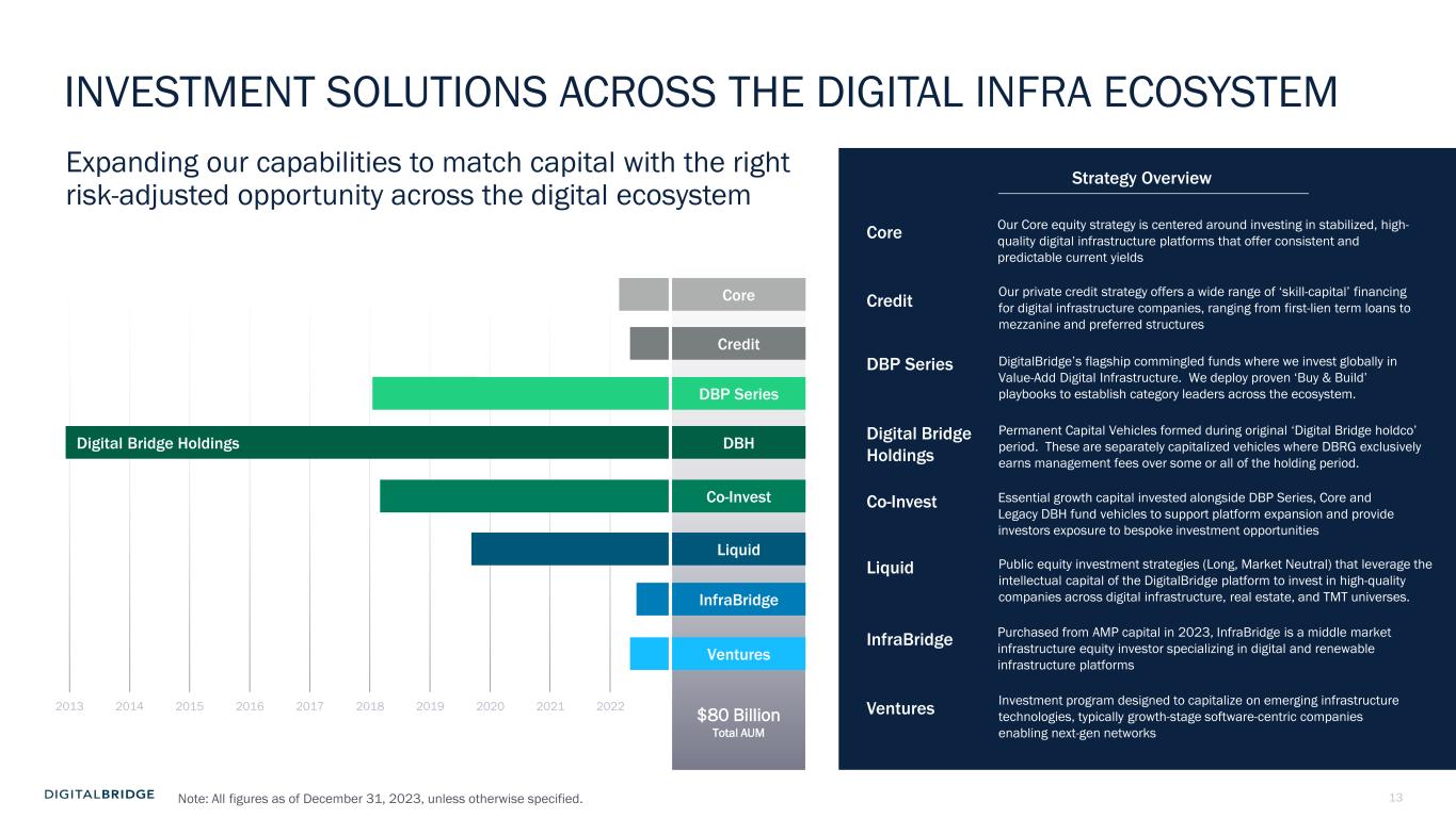 12 2019 2020 2021 2022 2023 InfraBridge Co-invest$18.3B $12.8B $6.8B $32.8B IM F EE UM (A S RE PO RT ED ) FEE EARNING EQUITY UNDER MANAGEMENT GROWTH PROFILE Long-term contracted fee streams provide predictable revenue and earnings that we expect to grow over time Balanced, diversified portfolios built with the flexibility to evolve with the ecosystem Note: Individual components of the graph are not to scale (1) In the instance of multiple iteration strategies, “Launch Date” refers to the close date of the first iteration of capital-bearing vehicle BUILDING BALANCED PORTFOLIOS Illustrative Portfolio Construction EQUITY FUNDS LAUNCH DATE(1) FEEUM Permanent Capital Vehicles 2013 $2.4B DBP Series 2018 $12.9B Co-Invest 2020 $9.6B Core, Credit, Liquid 2018, 2022 $2.7B InfraBridge 2023 $5.1B Total (As of 12/31/23) $32.8B Asia North America Europe Rest of World 25% 35% 30% 10% Geographic Asset Class Fiber Data Centers Towers Small Cells 20% 40% 30% 10% Note: Not representative of current portfolio construction $22.2B Core, Credit, Liquid Permanent Capital DBP Series +48% FEEUM CAGR 19’ - 23’