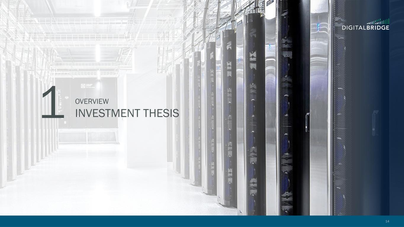 13 INVESTMENT SOLUTIONS ACROSS THE DIGITAL INFRA ECOSYSTEM DBP I DBP Series Permanent Capital Vehicles formed during original ‘Digital Bridge holdco’ period. These are separately capitalized vehicles where DBRG exclusively earns management fees over some or all of the holding period. Co-Invest Credit Core Liquid Public equity investment strategies (Long, Market Neutral) that leverage the intellectual capital of the DigitalBridge platform to invest in high-quality companies across digital infrastructure, real estate, and TMT universes. Our Core equity strategy is centered around investing in stabilized, high- quality digital infrastructure platforms that offer consistent and predictable current yields Our private credit strategy offers a wide range of ‘skill-capital’ financing for digital infrastructure companies, ranging from first-lien term loans to mezzanine and preferred structures Investment program designed to capitalize on emerging infrastructure technologies, typically growth-stage software-centric companies enabling next-gen networks Digital Bridge Holdings DigitalBridge’s flagship commingled funds where we invest globally in Value-Add Digital Infrastructure. We deploy proven ‘Buy & Build’ playbooks to establish category leaders across the ecosystem. Digital Bridge Holdings Ventures InfraBridge Liquid DBP Series DBH Co-Invest Credit Core InfraBridge Purchased from AMP capital in 2023, InfraBridge is a middle market infrastructure equity investor specializing in digital and renewable infrastructure platforms Ventures Essential growth capital invested alongside DBP Series, Core and Legacy DBH fund vehicles to support platform expansion and provide investors exposure to bespoke investment opportunities 2013 2018 2020 202120192017201620152014 2022 $80 Billion Total AUM Expanding our capabilities to match capital with the right risk-adjusted opportunity across the digital ecosystem Strategy Overview Note: All figures as of December 31, 2023, unless otherwise specified.
