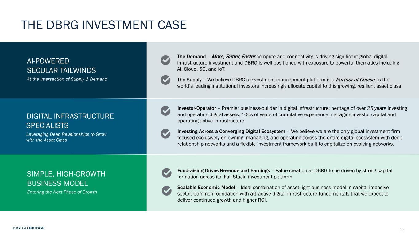 15 THE DBRG INVESTMENT CASE The Demand – More, Better, Faster compute and connectivity is driving significant global digital infrastructure investment and DBRG is well positioned with exposure to powerful thematics including AI, Cloud, 5G, and IoT. The Supply – We believe DBRG’s investment management platform is a Partner of Choice as the world’s leading institutional investors increasingly allocate capital to this growing, resilient asset class Investor-Operator – Premier business-builder in digital infrastructure; heritage of over 25 years investing and operating digital assets; 100s of years of cumulative experience managing investor capital and operating active infrastructure Investing Across a Converging Digital Ecosystem – We believe we are the only global investment firm focused exclusively on owning, managing, and operating across the entire digital ecosystem with deep relationship networks and a flexible investment framework built to capitalize on evolving networks. Fundraising Drives Revenue and Earnings – Value creation at DBRG to be driven by strong capital formation across its ‘Full-Stack’ investment platform Scalable Economic Model – Ideal combination of asset-light business model in capital intensive sector. Common foundation with attractive digital infrastructure fundamentals that we expect to deliver continued growth and higher ROI. At the Intersection of Supply & Demand AI-POWERED SECULAR TAILWINDS Leveraging Deep Relationships to Grow with the Asset Class DIGITAL INFRASTRUCTURE SPECIALISTS Entering the Next Phase of Growth SIMPLE, HIGH-GROWTH BUSINESS MODEL