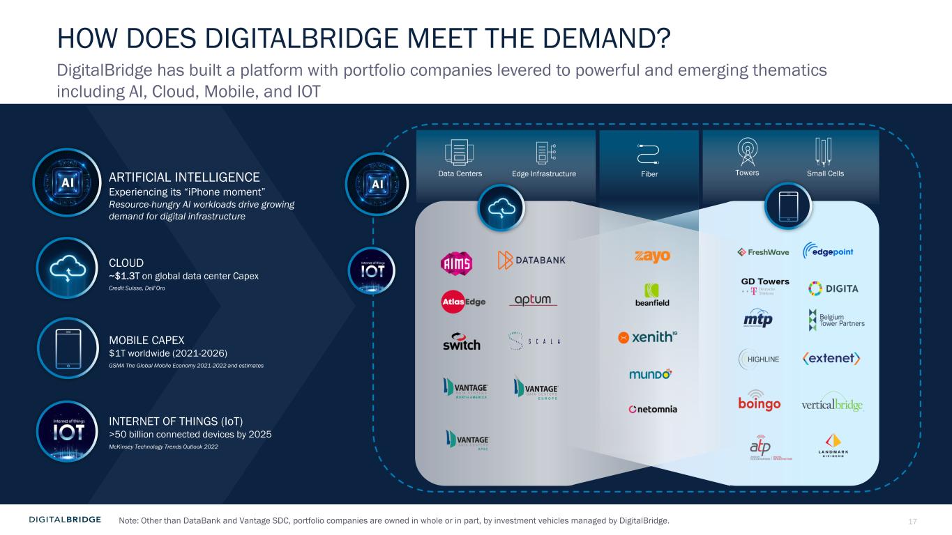 16 Data Centers Will Need Far More Power Source: AvidThink TE RA W AT T- HO UR S 20402038203620342032203020282026 0 500 1,000 1,500 8.15% CAGR 25% CAGR MORE COMPUTE AND PIPES REQUIRED Digital Infra Ensures Secure, Scalable, and Reliable Compute Power PRE-AI GROWTH: GLOBAL DIGITAL INFRA CAPEX INVESTMENT PROJECTED OVER $400B ANNUALLY Global Mobile Network Data Traffic (EB per month) Source: Ericsson Mobility Q4 2023 AI set to further accelerate exponential data traffic growth ILLUSTRATIVE THE DEMAND: MORE, BETTER, FASTER CONNECTIVITY & COMPUTE Global Data Center Capex Cumulative Global Hyperscale + Non Hyperscale CapEx (billion) 2021 2022 2023 2024 2025 2026 2021 2022 2023 2024 2025 2026 $253 $237$222 $207$193$183 Global Hyperscale Global Non Hyperscale $1.3T Credit Suisse, Dell’Oro Global Mobile Capex $183$180$178$170 $155 $132 CapEx 2021–2026 (billion) GSMA The Global Mobile Economy 2021-2022 and estimates $1T DEMAND DRIVERS FUEL DATA TRAFFIC'S EXPONENTIAL GROWTH ~80% of all data center power will be consumed by AI AI workloads are computationally intensive driving more compute Disclaimer: DigitalBridge's market characterization on artificial intelligence (AI) is based on subjective determinations that it believes are reasonable but other investors may disagree with such characterization. There is no guarantee that historical trends will continue. There can be no assurance that the investment objectives or pipeline opportunities described herein will be achieved, and results will likely vary substantially over time.