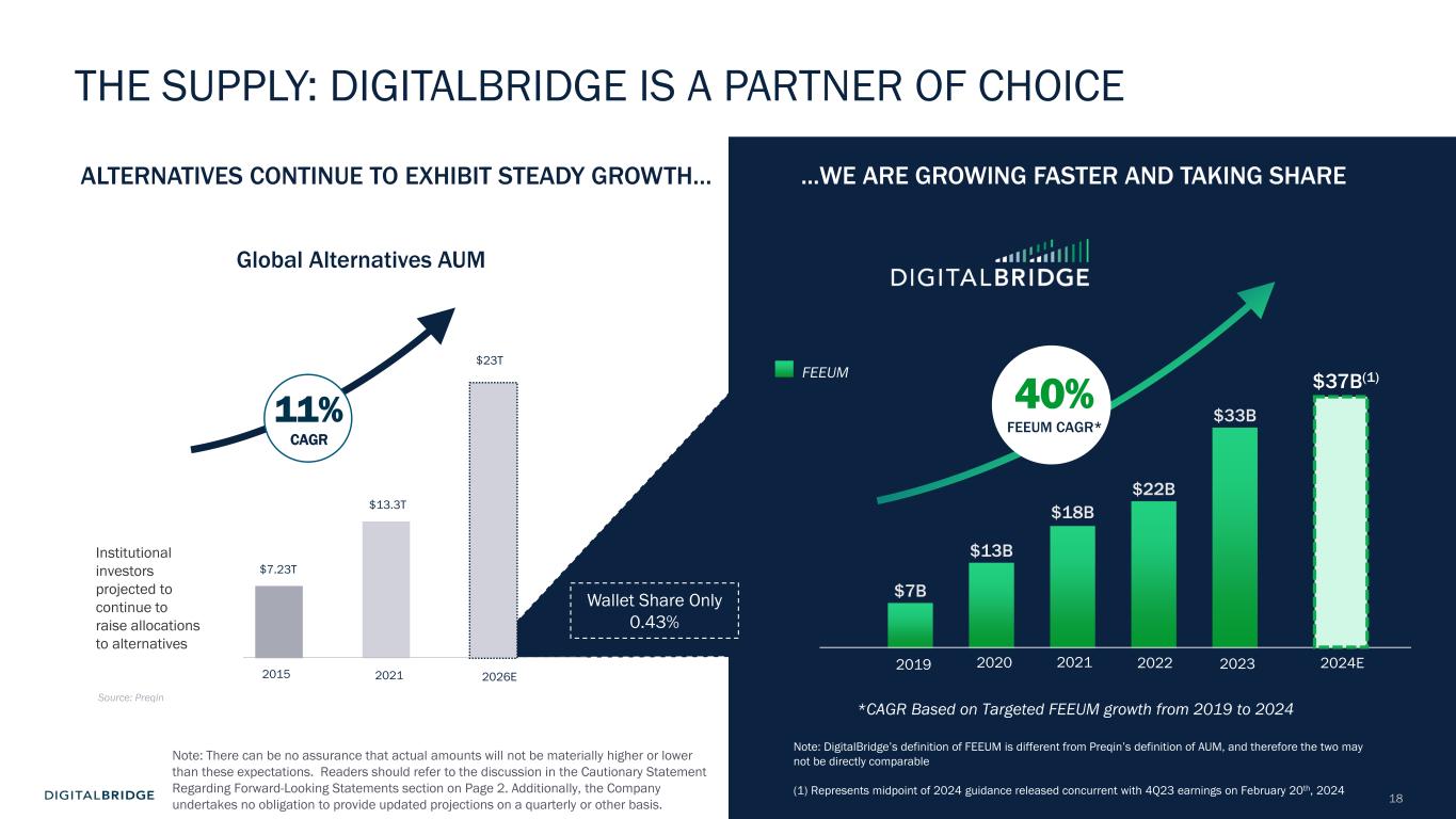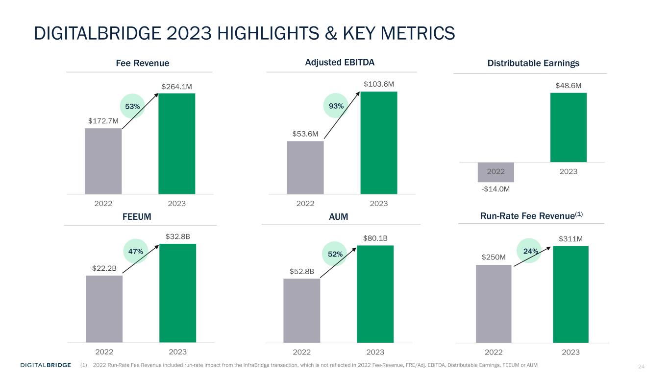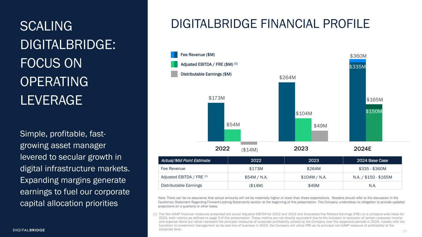 23 $173M $264M $360M $54M $104M $165M ($14M) $49M SCALING DIGITALBRIDGE: FOCUS ON OPERATING LEVERAGE Simple, profitable, fast- growing asset manager levered to secular growth in digital infrastructure markets. Expanding margins generate earnings to fuel our corporate capital allocation priorities Note: There can be no assurance that actual amounts will not be materially higher or lower than these expectations. Readers should refer to the discussion in the Cautionary Statement Regarding Forward-Looking Statements section at the beginning of this presentation. The Company undertakes no obligation to provide updated projections on a quarterly or other basis. Adjusted EBITDA / FRE ($M) (1) Distributable Earnings ($M) 2022 2023 2024E Fee Revenue ($M) (1) The Non-GAAP financial measures presented are actual Adjusted EBITDA for 2022 and 2023 and forecasted Fee Related Earnings (FRE) on a company-wide basis for 2024, both metrics as defined on page 3 of this presentation. These metrics are not directly equivalent due to the inclusion or exclusion of certain corporate income and expense items but rather represent the principal measures of corporate profitability utilized by the Company over the respective periods in 2024, notably with the transition to investment management as its sole line of business in 2024, the Company will utilize FRE as its principal non-GAAP measure of profitability at the corporate level. $150M $335M Actual/Mid Point Estimate 2022 2023 2024 Base Case Fee Revenue $173M $264M $335 - $360M Adjusted EBITDA / FRE (1) $54M / N.A. $104M / N.A. N.A. / $150 - $165M Distributable Earnings ($14M) $49M N.A. DIGITALBRIDGE FINANCIAL PROFILE
