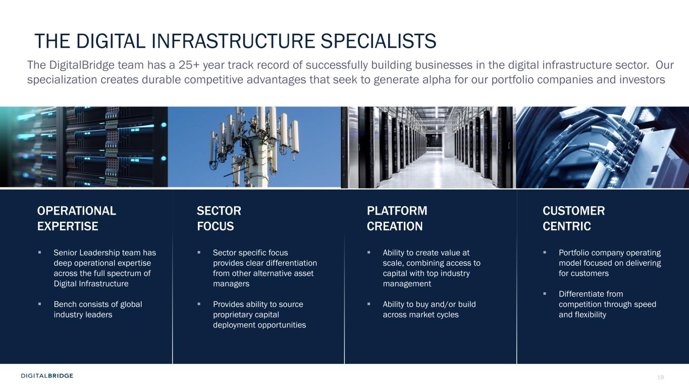18 THE SUPPLY: DIGITALBRIDGE IS A PARTNER OF CHOICE ALTERNATIVES CONTINUE TO EXHIBIT STEADY GROWTH… ...WE ARE GROWING FASTER AND TAKING SHARE Global Alternatives AUM Source: Preqin Institutional investors projected to continue to raise allocations to alternatives 11% CAGR Wallet Share Only 0.43% $7.23T $13.3T 20212015 2026E $23T $7B $13B $18B $22B $33B FEEUM 40% FEEUM CAGR* 2019 2020 2021 2022 2024E $37B(1) Note: DigitalBridge’s definition of FEEUM is different from Preqin’s definition of AUM, and therefore the two may not be directly comparable (1) Represents midpoint of 2024 guidance released concurrent with 4Q23 earnings on February 20th, 2024 *CAGR Based on Targeted FEEUM growth from 2019 to 2024 Note: There can be no assurance that actual amounts will not be materially higher or lower than these expectations. Readers should refer to the discussion in the Cautionary Statement Regarding Forward-Looking Statements section on Page 2. Additionally, the Company undertakes no obligation to provide updated projections on a quarterly or other basis. 2023