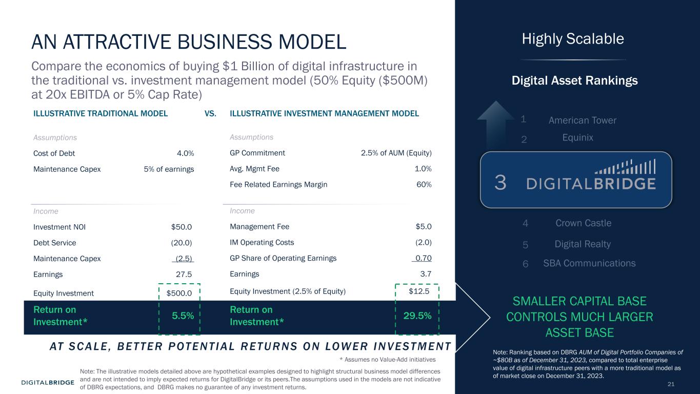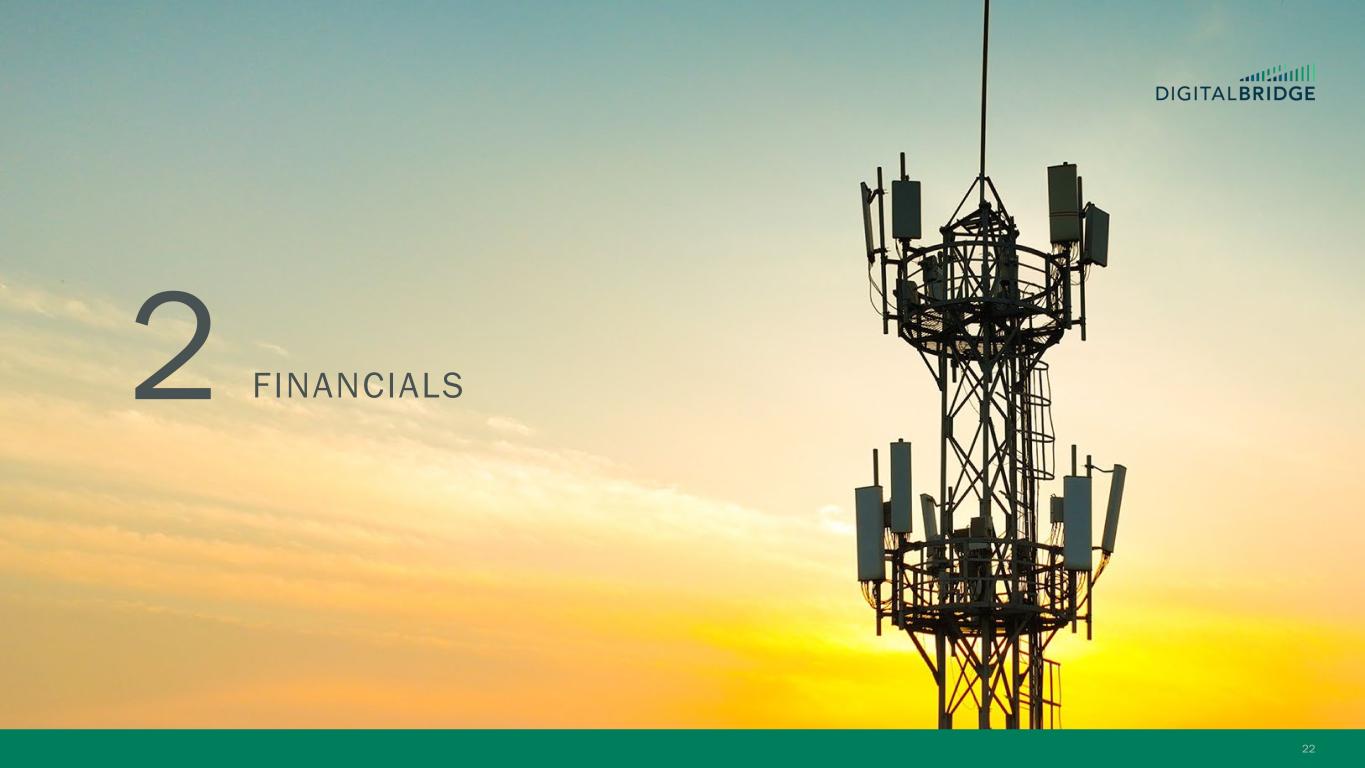 21 AN ATTRACTIVE BUSINESS MODEL Digital Asset Rankings Highly Scalable 3 Compare the economics of buying $1 Billion of digital infrastructure in the traditional vs. investment management model (50% Equity ($500M) at 20x EBITDA or 5% Cap Rate) ILLUSTRATIVE TRADITIONAL MODEL VS. ILLUSTRATIVE INVESTMENT MANAGEMENT MODEL Assumptions Assumptions Cost of Debt 4.0% GP Commitment 2.5% of AUM (Equity) Maintenance Capex 5% of earnings Avg. Mgmt Fee 1.0% Fee Related Earnings Margin 60% Income Income Investment NOI $50.0 Management Fee $5.0 Debt Service (20.0) IM Operating Costs (2.0) Maintenance Capex (2.5) GP Share of Operating Earnings 0.70 Earnings 27.5 Earnings 3.7 Equity Investment $500.0 Equity Investment (2.5% of Equity) $12.5 Return on Investment* 5.5% Return on Investment* 29.5% SMALLER CAPITAL BASE CONTROLS MUCH LARGER ASSET BASE AT SCALE , BETTER POTENT IAL RETU RNS O N LOWER INVESTMENT * Assumes no Value-Add initiatives Note: Ranking based on DBRG AUM of Digital Portfolio Companies of ~$80B as of December 31, 2023, compared to total enterprise value of digital infrastructure peers with a more traditional model as of market close on December 31, 2023. Note: The illustrative models detailed above are hypothetical examples designed to highlight structural business model differences and are not intended to imply expected returns for DigitalBridge or its peers.The assumptions used in the models are not indicative of DBRG expectations, and DBRG makes no guarantee of any investment returns.
