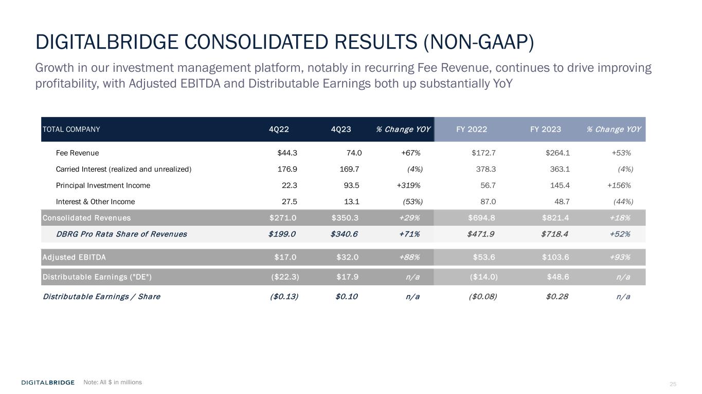 24 $53.6M $103.6M 2022 2023 $172.7M $264.1M 2022 2023 Distributable Earnings DIGITALBRIDGE 2023 HIGHLIGHTS & KEY METRICS Fee Revenue Adjusted EBITDA FEEUM AUM Run-Rate Fee Revenue(1) 53% 93% 47% 52% 24% -$14.0M $48.6M 2022 2023 $22.2B $32.8B 2022 2023 $52.8B $80.1B 2022 2023 $250M $311M 2022 2023 (1) 2022 Run-Rate Fee Revenue included run-rate impact from the InfraBridge transaction, which is not reflected in 2022 Fee-Revenue, FRE/Adj. EBITDA, Distributable Earnings, FEEUM or AUM