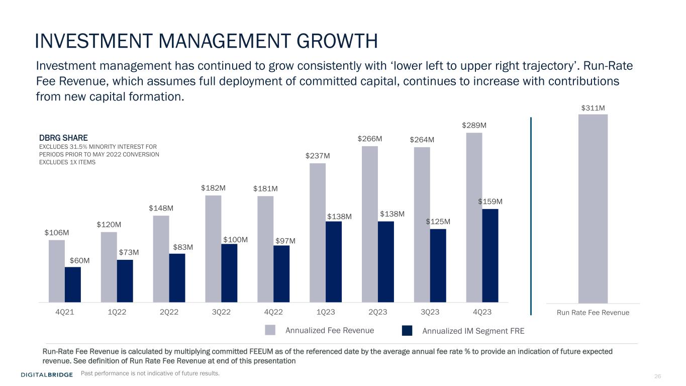 25 TOTAL COMPANY 4Q22 4Q23 % Change YOY FY 2022 FY 2023 % Change YOY Fee Revenue $44.3 74.0 +67% $172.7 $264.1 +53% Carried Interest (realized and unrealized) 176.9 169.7 (4%) 378.3 363.1 (4%) Principal Investment Income 22.3 93.5 +319% 56.7 145.4 +156% Interest & Other Income 27.5 13.1 (53%) 87.0 48.7 (44%) Consolidated Revenues $271.0 $350.3 +29% $694.8 $821.4 +18% DBRG Pro Rata Share of Revenues $199.0 $340.6 +71% $471.9 $718.4 +52% Adjusted EBITDA $17.0 $32.0 +88% $53.6 $103.6 +93% Distributable Earnings ("DE") ($22.3) $17.9 n/a ($14.0) $48.6 n/a Distributable Earnings / Share ($0.13) $0.10 n/a ($0.08) $0.28 n/a Growth in our investment management platform, notably in recurring Fee Revenue, continues to drive improving profitability, with Adjusted EBITDA and Distributable Earnings both up substantially YoY DIGITALBRIDGE CONSOLIDATED RESULTS (NON-GAAP) Note: All $ in millions