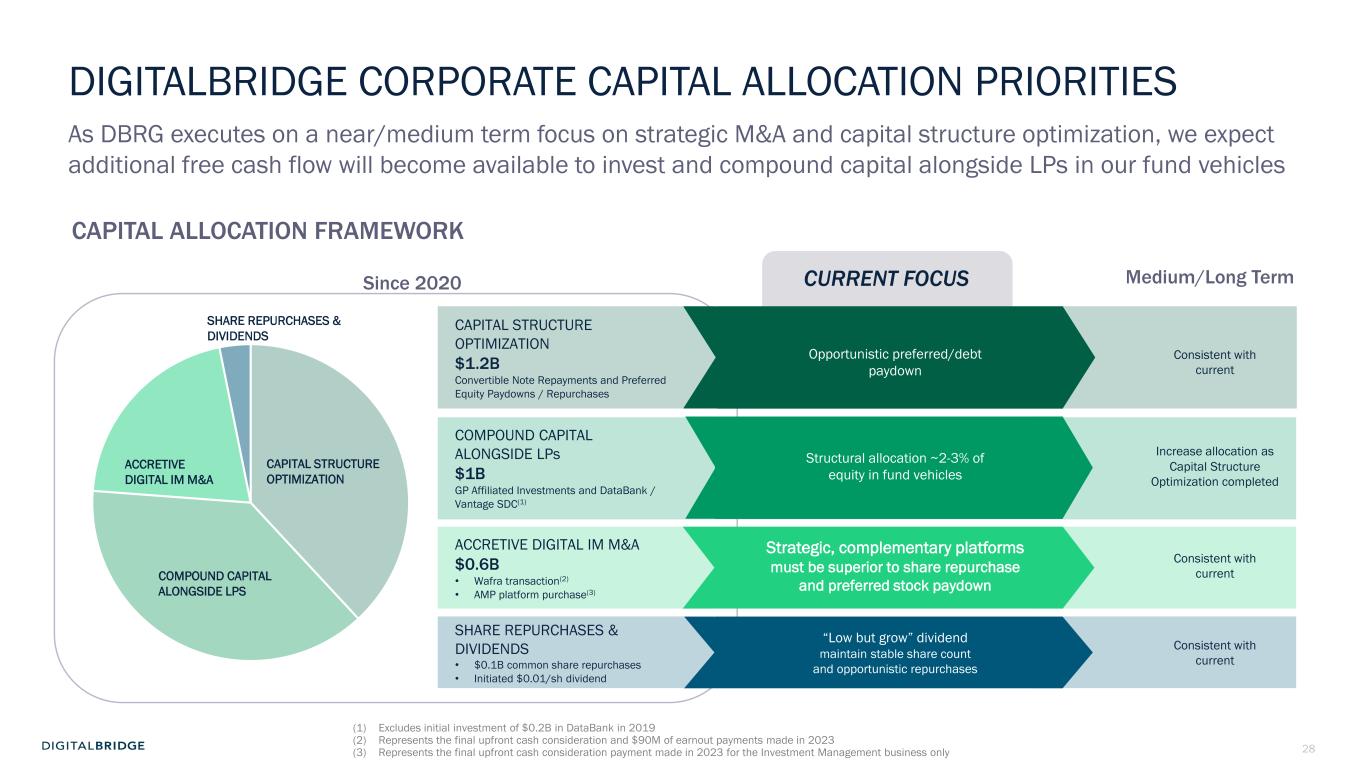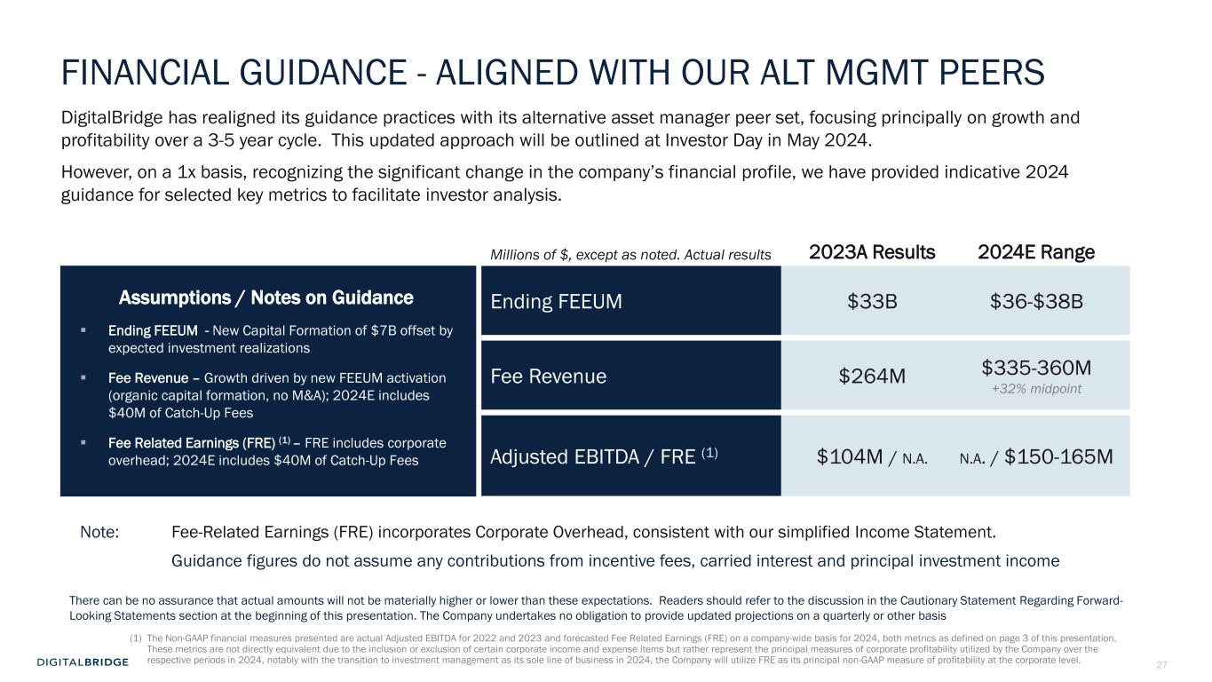 27 Millions of $, except as noted. Actual results 2023A Results 2024E Range Ending FEEUM $33B $36-$38B Fee Revenue $264M $335-360M +32% midpoint Adjusted EBITDA / FRE (1) $104M / N.A. N.A. / $150-165M FINANCIAL GUIDANCE - ALIGNED WITH OUR ALT MGMT PEERS Assumptions / Notes on Guidance  Ending FEEUM - New Capital Formation of $7B offset by expected investment realizations  Fee Revenue – Growth driven by new FEEUM activation (organic capital formation, no M&A); 2024E includes $40M of Catch-Up Fees  Fee Related Earnings (FRE) (1) – FRE includes corporate overhead; 2024E includes $40M of Catch-Up Fees DigitalBridge has realigned its guidance practices with its alternative asset manager peer set, focusing principally on growth and profitability over a 3-5 year cycle. This updated approach will be outlined at Investor Day in May 2024. However, on a 1x basis, recognizing the significant change in the company’s financial profile, we have provided indicative 2024 guidance for selected key metrics to facilitate investor analysis. Note: Fee-Related Earnings (FRE) incorporates Corporate Overhead, consistent with our simplified Income Statement. Guidance figures do not assume any contributions from incentive fees, carried interest and principal investment income (1) The Non-GAAP financial measures presented are actual Adjusted EBITDA for 2022 and 2023 and forecasted Fee Related Earnings (FRE) on a company-wide basis for 2024, both metrics as defined on page 3 of this presentation. These metrics are not directly equivalent due to the inclusion or exclusion of certain corporate income and expense items but rather represent the principal measures of corporate profitability utilized by the Company over the respective periods in 2024, notably with the transition to investment management as its sole line of business in 2024, the Company will utilize FRE as its principal non-GAAP measure of profitability at the corporate level. There can be no assurance that actual amounts will not be materially higher or lower than these expectations. Readers should refer to the discussion in the Cautionary Statement Regarding Forward- Looking Statements section at the beginning of this presentation. The Company undertakes no obligation to provide updated projections on a quarterly or other basis