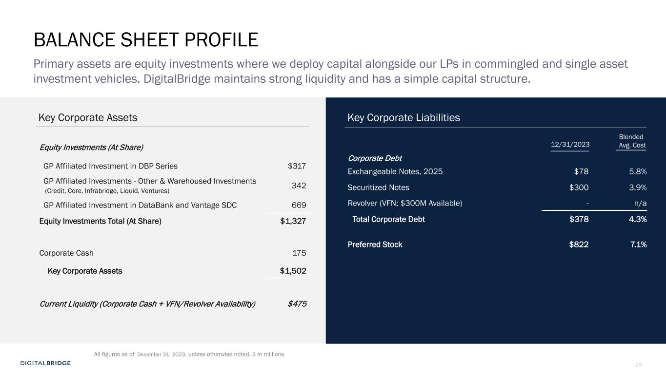 28 DIGITALBRIDGE CORPORATE CAPITAL ALLOCATION PRIORITIES As DBRG executes on a near/medium term focus on strategic M&A and capital structure optimization, we expect additional free cash flow will become available to invest and compound capital alongside LPs in our fund vehicles (1) Excludes initial investment of $0.2B in DataBank in 2019 (2) Represents the final upfront cash consideration and $90M of earnout payments made in 2023 (3) Represents the final upfront cash consideration payment made in 2023 for the Investment Management business only COMPOUND CAPITAL ALONGSIDE LPs $1B GP Affiliated Investments and DataBank / Vantage SDC(1) ACCRETIVE DIGITAL IM M&A $0.6B • Wafra transaction(2) • AMP platform purchase(3) CAPITAL STRUCTURE OPTIMIZATION $1.2B Convertible Note Repayments and Preferred Equity Paydowns / Repurchases SHARE REPURCHASES & DIVIDENDS • $0.1B common share repurchases • Initiated $0.01/sh dividend CAPITAL ALLOCATION FRAMEWORK Since 2020 Opportunistic preferred/debt paydown Consistent with current Structural allocation ~2-3% of equity in fund vehicles Increase allocation as Capital Structure Optimization completed Strategic, complementary platforms must be superior to share repurchase and preferred stock paydown Consistent with current “Low but grow” dividend maintain stable share count and opportunistic repurchases Consistent with current CURRENT FOCUS Medium/Long Term COMPOUND CAPITAL ALONGSIDE LPS CAPITAL STRUCTURE OPTIMIZATION SHARE REPURCHASES & DIVIDENDS ACCRETIVE DIGITAL IM M&A