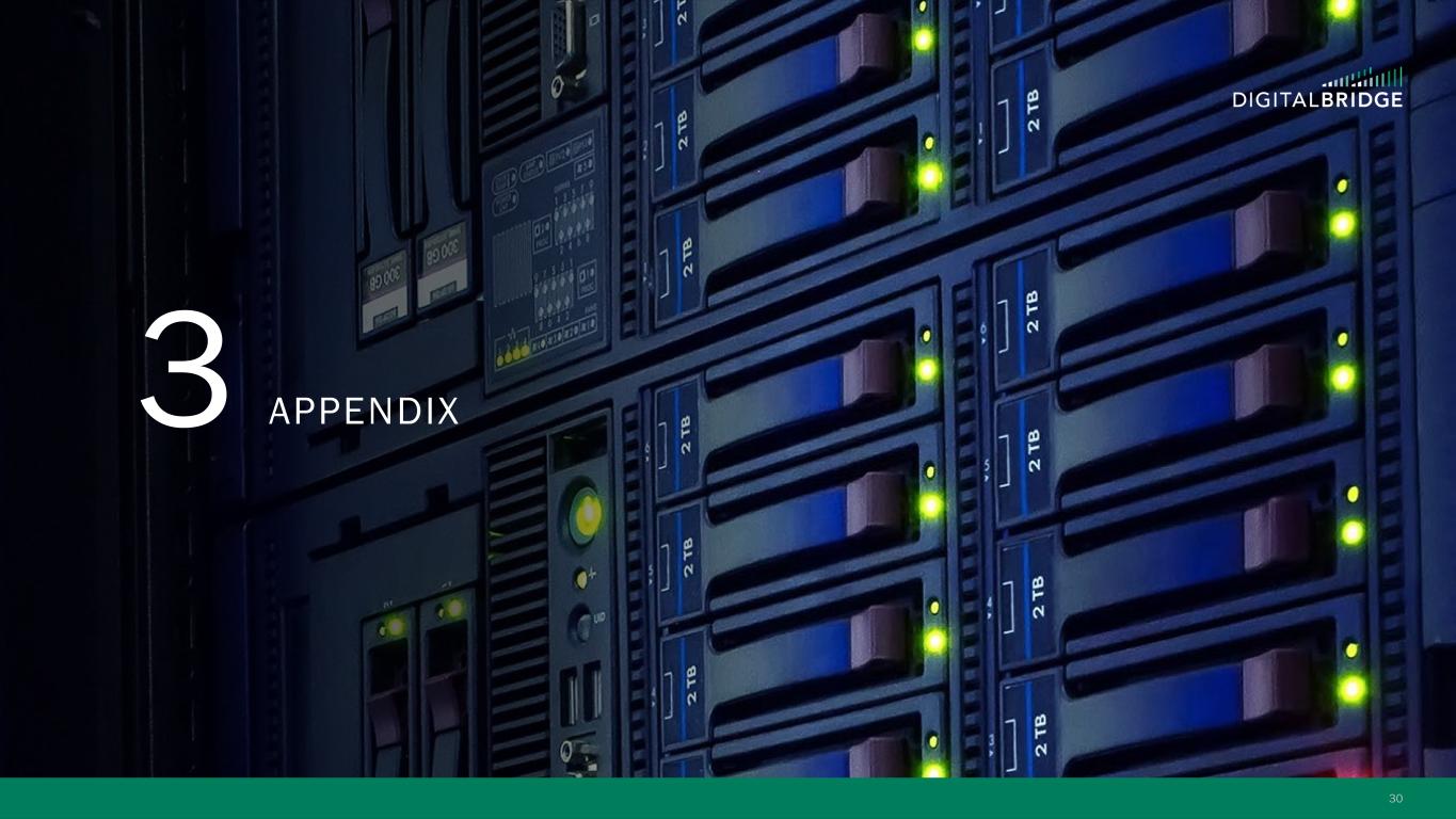 29 BALANCE SHEET PROFILE Key Corporate Assets Equity Investments (At Share) GP Affiliated Investment in DBP Series $317 GP Affiliated Investments - Other & Warehoused Investments (Credit, Core, Infrabridge, Liquid, Ventures) 342 GP Affiliated Investment in DataBank and Vantage SDC 669 Equity Investments Total (At Share) $1,327 Corporate Cash 175 Key Corporate Assets $1,502 Current Liquidity (Corporate Cash + VFN/Revolver Availability) $475 Key Corporate Liabilities Primary assets are equity investments where we deploy capital alongside our LPs in commingled and single asset investment vehicles. DigitalBridge maintains strong liquidity and has a simple capital structure. All figures as of December 31, 2023. unless otherwise noted, $ in millions Corporate Debt Exchangeable Notes, 2025 $78 5.8% Securitized Notes $300 3.9% Revolver (VFN; $300M Available) - n/a Total Corporate Debt $378 4.3% Preferred Stock $822 7.1% Blended Avg. Cost12/31/2023